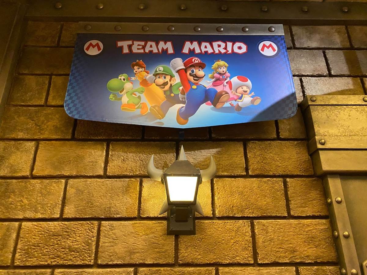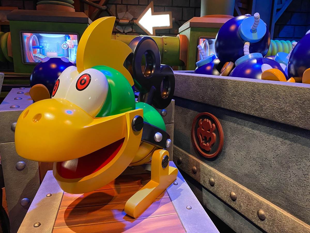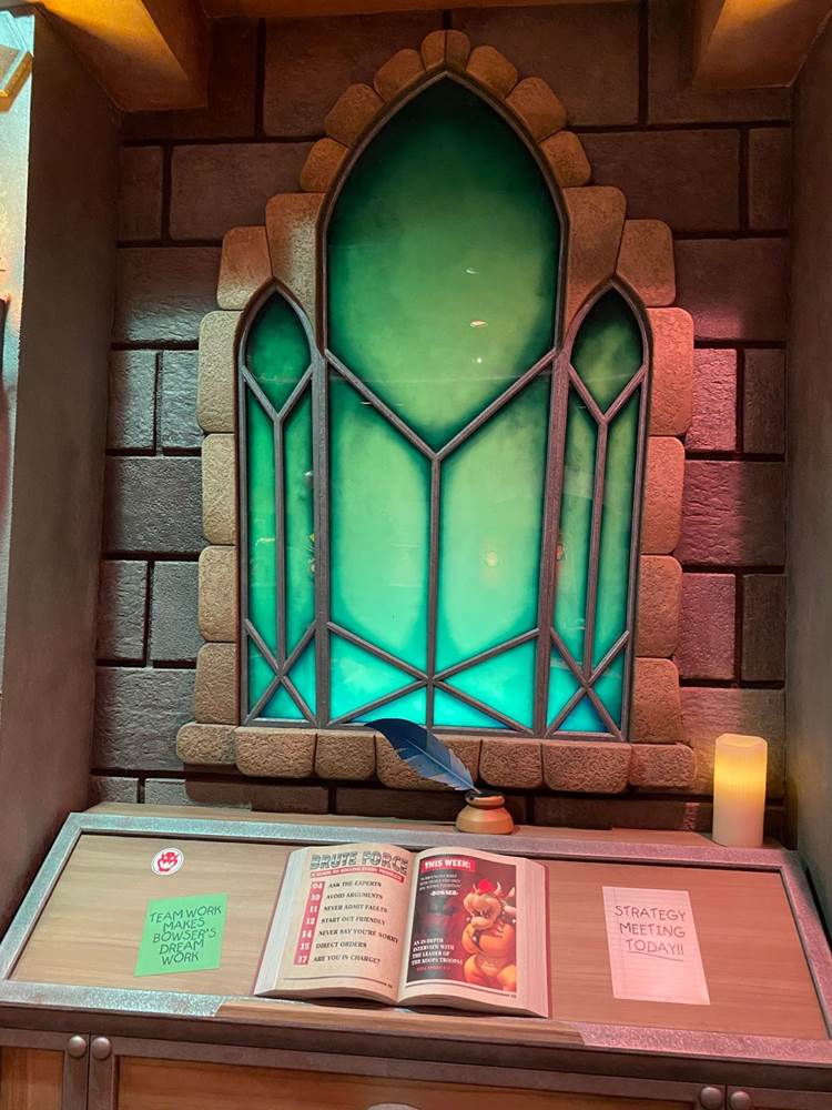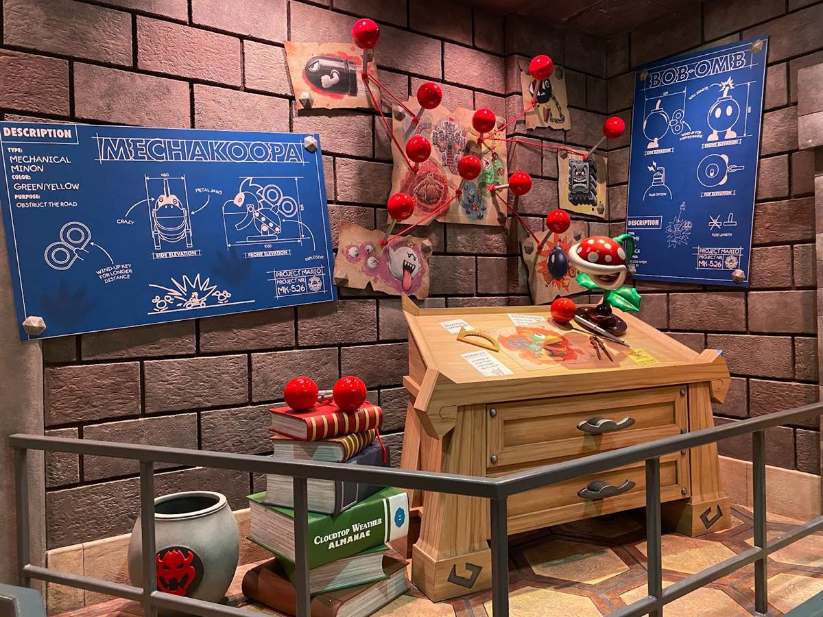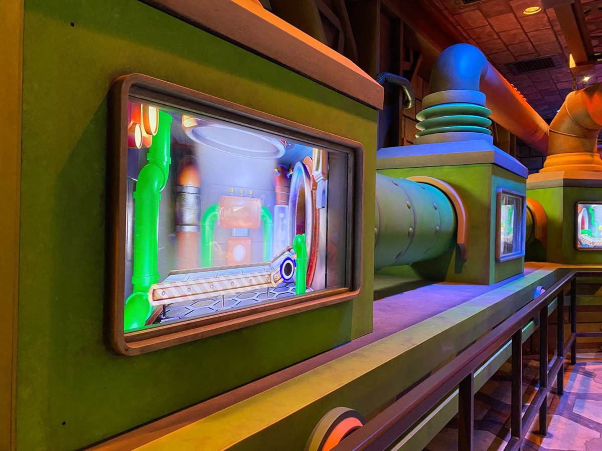 There are also a couple different costumed character experiences: guests can meet Princess Peach, and of course the brothers Mario and Luigi around the land. “The Mario meet-and-greet is right in the middle, and the characters are capable of communicating with you," added Corfino. “And guess what– since we’re in a game, they know your score." That promise reminds me an awful lot of the credit system at Galaxy’s Edge, so I’m very curious to see if it pays off in Super Nintendo World than it has on the planet Batuu. During our hour-long visit to the land today, we did not have the opportunity to ride the Mario Kart: Bowser’s Challenge attraction, but we did walk through its impressive queue. “We’re all about variable attendance levels," said Corfino about the winding switchbacks. On busier days, the line is capable of extending into additional rooms and up stairs. We also walked past some AR viewfinders that allow guests to look out over the land with added characters, effects, and details. But the most detailed parts of the queue are the last few rooms leading up to the boarding area of the ride itself, which take you through Bowser’s study and laboratory before guiding you through the concept of the attraction and your role in the experience.