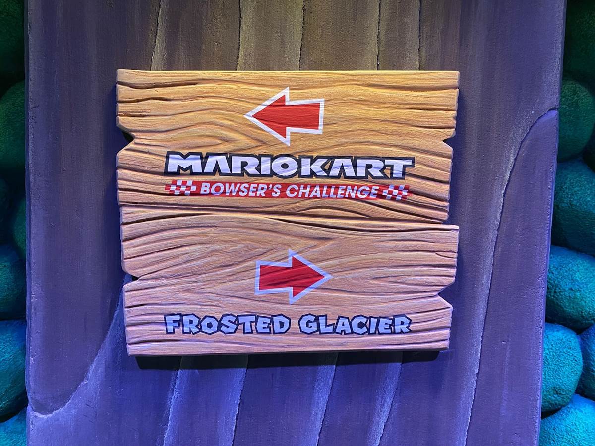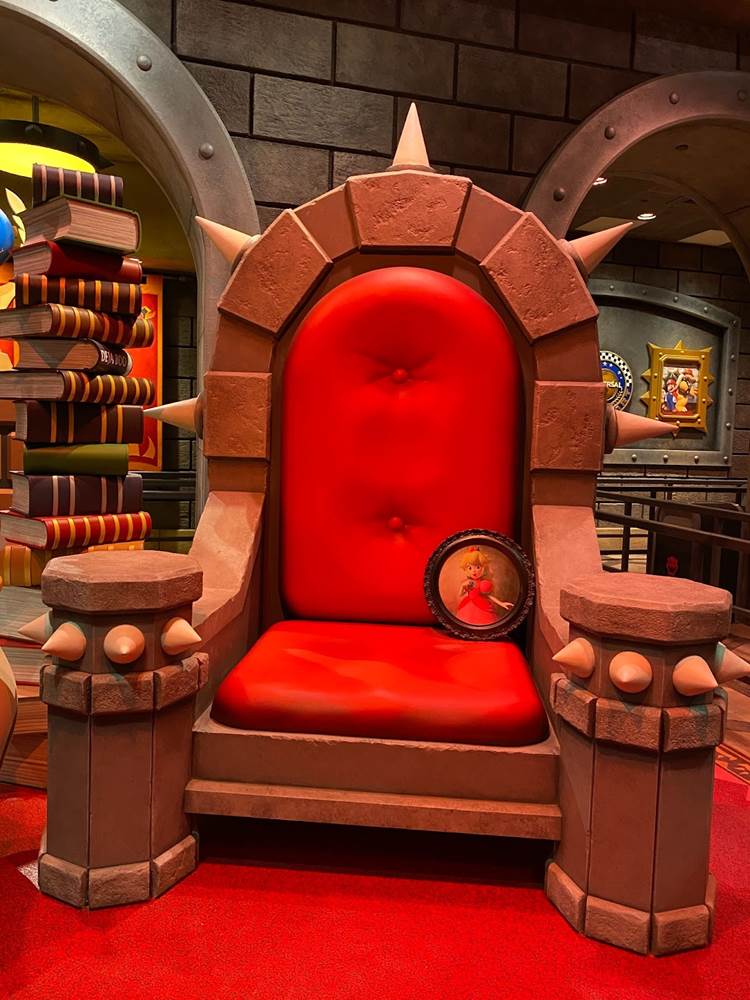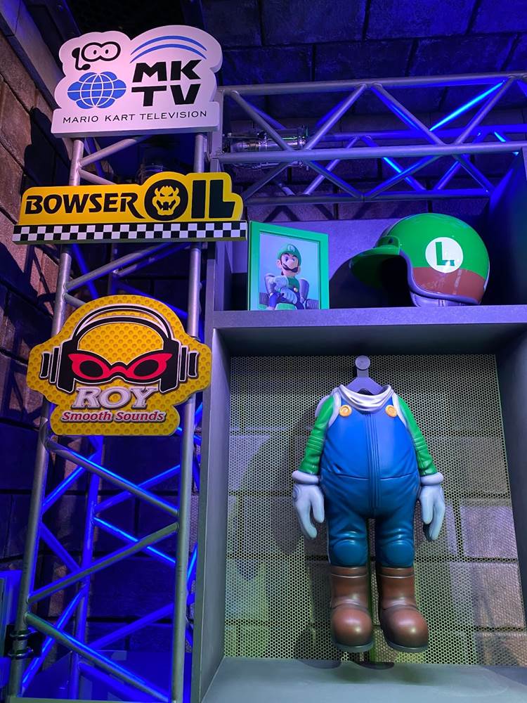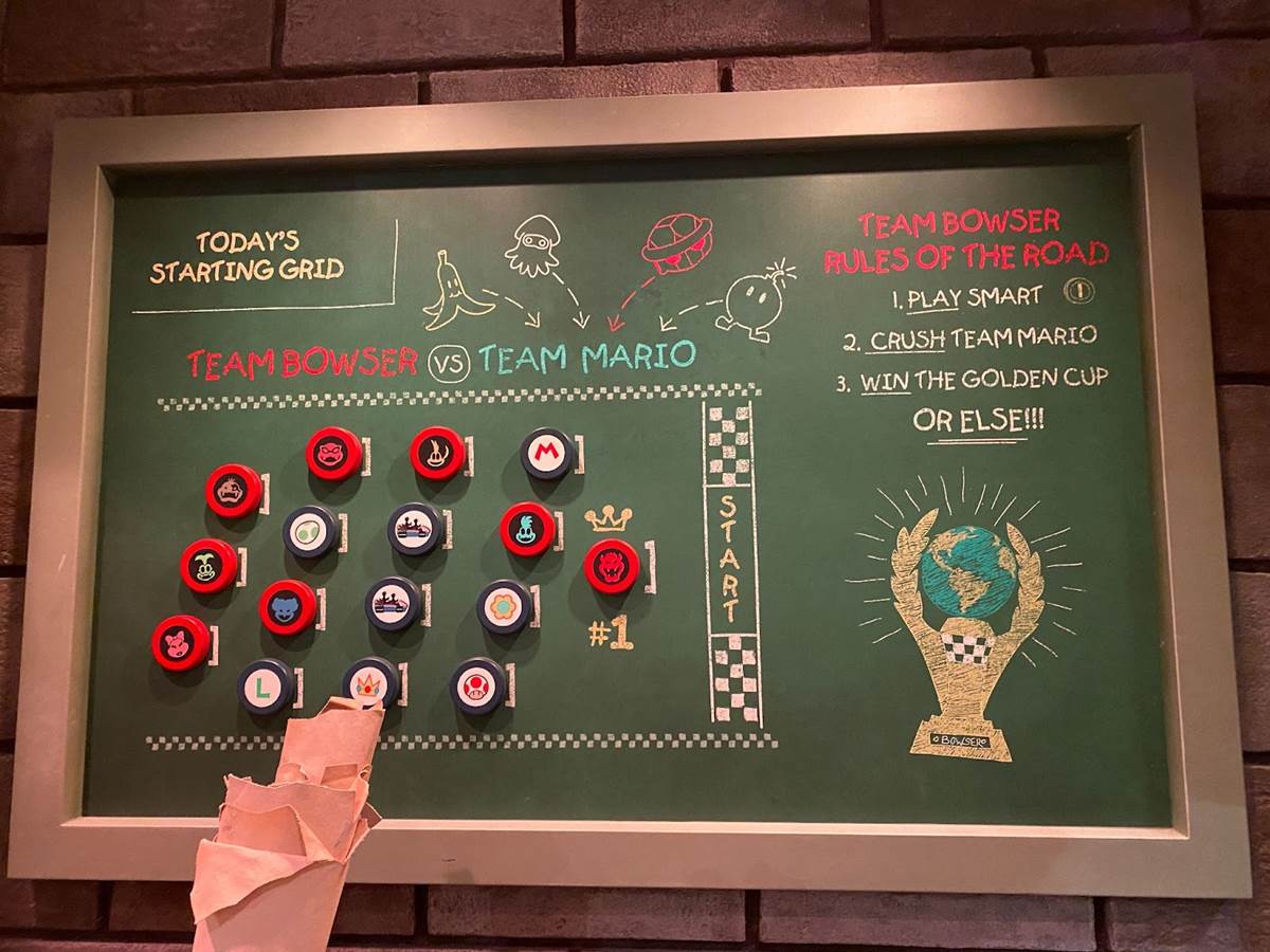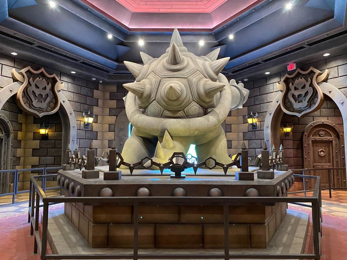 There are also a couple different costumed character experiences: guests can meet Princess Peach, and of course the brothers Mario and Luigi around the land. “The Mario meet-and-greet is right in the middle, and the characters are capable of communicating with you," added Corfino. “And guess what– since we’re in a game, they know your score." That promise reminds me an awful lot of the credit system at Galaxy’s Edge, so I’m very curious to see if it pays off in Super Nintendo World than it has on the planet Batuu. During our hour-long visit to the land today, we did not have the opportunity to ride the Mario Kart: Bowser’s Challenge attraction, but we did walk through its impressive queue. “We’re all about variable attendance levels," said Corfino about the winding switchbacks. On busier days, the line is capable of extending into additional rooms and up stairs. We also walked past some AR viewfinders that allow guests to look out over the land with added characters, effects, and details. But the most detailed parts of the queue are the last few rooms leading up to the boarding area of the ride itself, which take you through Bowser’s study and laboratory before guiding you through the concept of the attraction and your role in the experience.