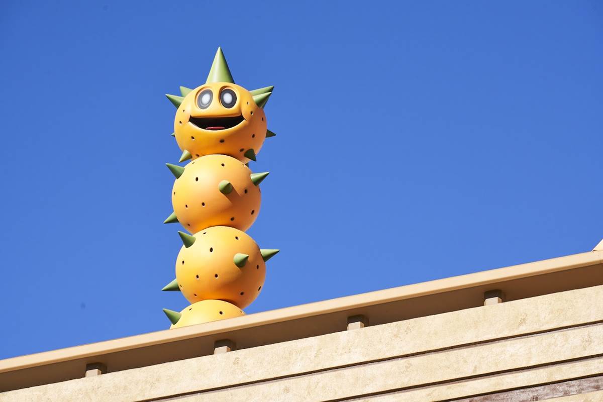 “There’s a lot of kinetic activity. You’ll see it everywhere. There’s no rules here– it’s just like the game: you can explore however you want to, in whatever order. It’s all about discovery." At that point, Jon swiped his Power-Up band against Mario’s initial on a wall, which conjured up a pixel-art of Princess Peach. “There is a storyline behind the whole land, and that is that Peach has had her golden mushroom stolen by Bowser Jr. He basically absconds with it, and we have what we call four key challenges in the land. And we have the opportunity, should we choose to accept it, to help her get the golden mushroom back." After completing the four key challenges, guests can proceed to an interactive game called “Boss Battle Jr.," which sees them jumping for blocks and flinging fireballs at a variety of enemies projected onto a giant wrap-around screen. Other mini-games called “Piranha Sleepers" and “Goomba Gimme" are accessible in the exterior areas, each factoring into the key challenges. “That’s really the big difference here. As opposed to other rides and attractions that we’ve done, this is putting you into a game, not trying to take you backstage at a movie [set]. This is more like you are inside the game."