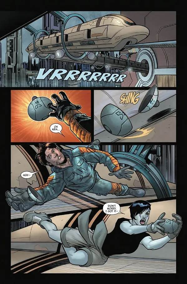 The reason the Ajax Sigma revelation is so exciting is because it ties this Han Solo & Chewbacca miniseries in with not only the current era of Star Wars comics set between the events of The Empire Strikes Back and Return of the Jedi, but also potentially The High Republic era, as Ajax’s initial uprising is said to have taken place two hundred years earlier. There’s nothing I love to see more in these titles than the interconnected nature that only comes from the various writers working together with the Lucasfilm Story Group– and I almost wish the entire Star Wars content machine operated this way. Regardless, our antiheroes manage to escape Vancto and the smugglers, but once Han and Chewie return to the Millennium Falcon they find that Corbus Tyra (the thief who posed as Han Solo’s father Ovan in earlier issues) has taken up residence in the ship, and demands that they turn over the neural core. Now this is a cliffhanger I can get behind, as it’s sure to lead us into an exciting final issue for this miniseries, due out in March. Overall, Star Wars: Han Solo & Chewbacca has been a hit-or-miss ride for me so far, but this issue was great with some wonderful character moments– one thing writer Marc Guggenheim has definitely mastered is the voices of these characters. I’m holding out confidence that he and artist David Messina will close this ten-issue miniseries out on a strong note.