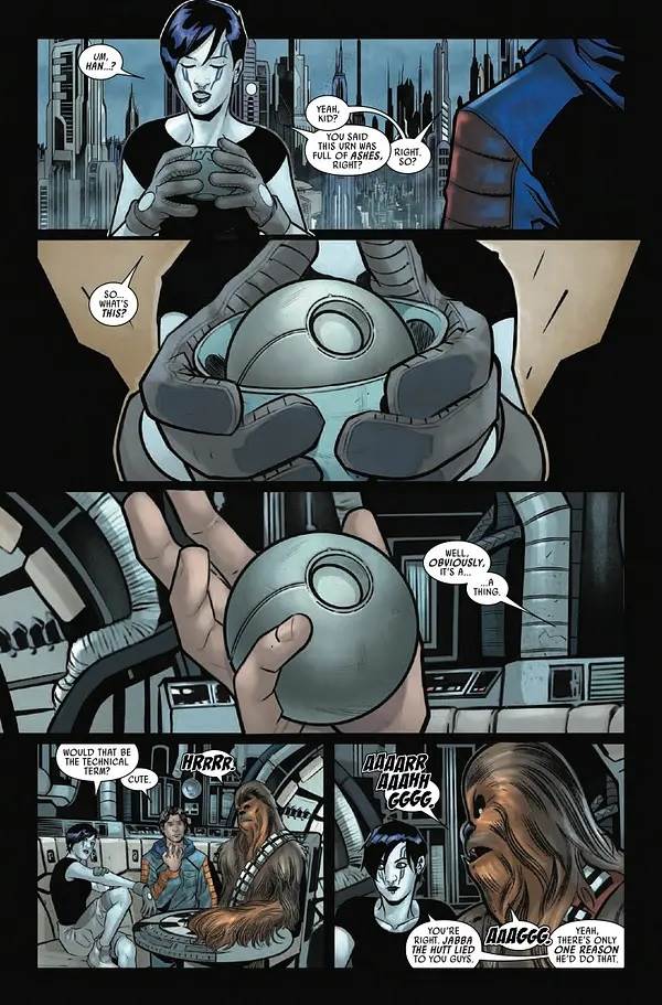But from there the story gets a whole lot more interesting, as Han, Chewie, and their new cohort Phaedra open the urn they stole for Jabba the Hutt to discover that it does not, in fact, contain the ashes of one of his nemeses as he said. To figure out what it does actually contain, they must travel to the Smugglers’ Moon of Nar Shaddaa, where an Ugnaught acquaintance of Lando Calrissian (great to see Han and Lando’s frenemy relationship during this point in their lives referenced here) tells them that it’s actually the neural core of a centuries-old freedom-fighting droid named Ajax Sigma. If that name sounds familiar, it’s because it was first dropped in the Star Wars: Revelations one-shot this past November, as Darth Vader saw into the future of Star Wars comic storytelling. It’s a great surprise to have that introduction pay off here, even though it kind of spoils what Han and Chewbacca end up doing with the neural core next issue. At the same time, Han and friends are being hunted by both Marshal Buck Vancto and a rival gang of smugglers, both of whom have different reasons for getting their hands on our favorite scoundrel and his loyal Wookiee companion.