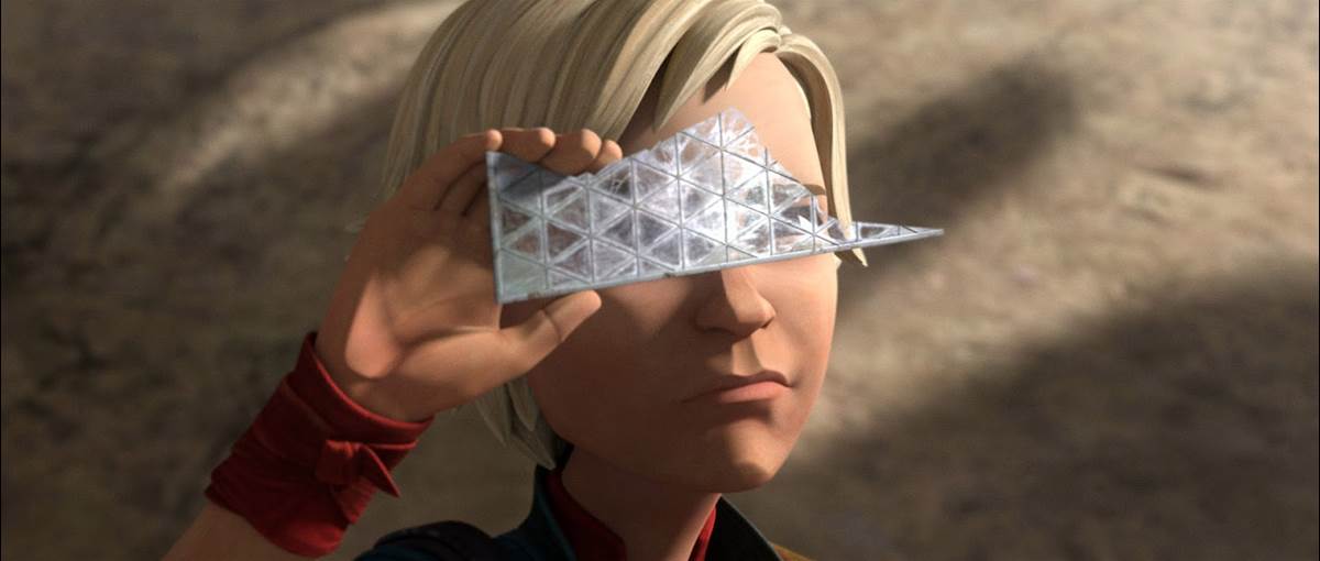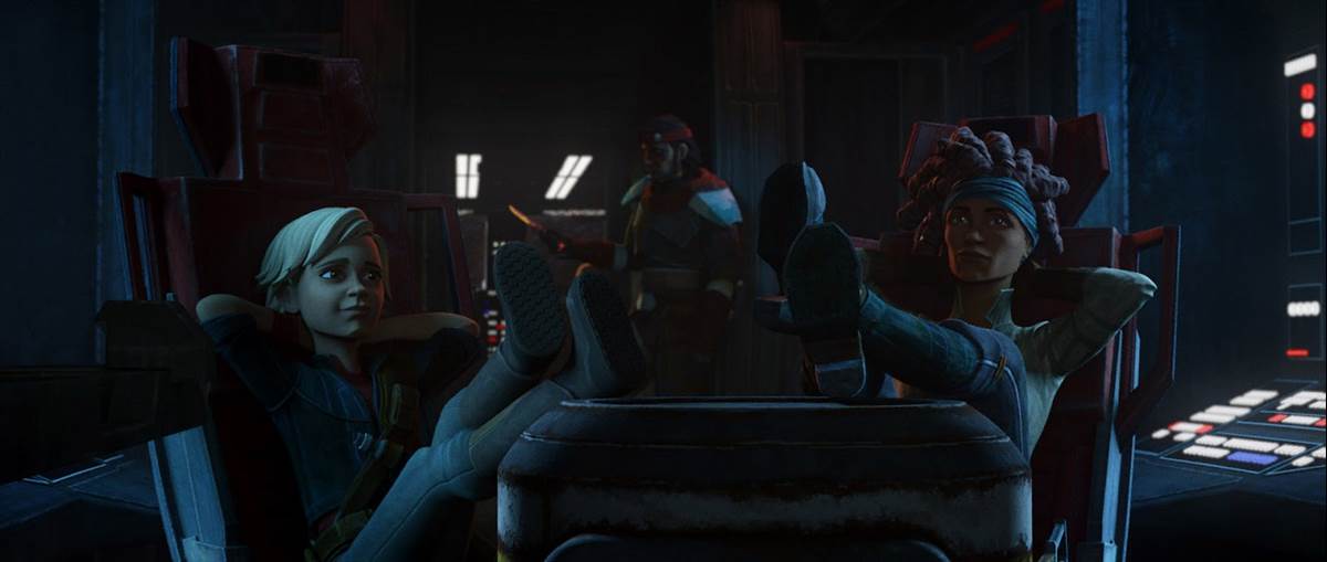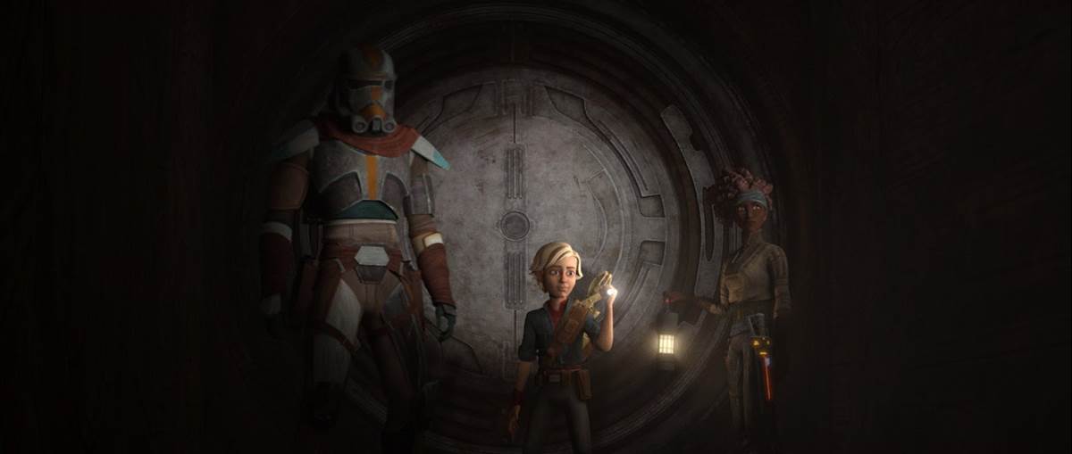 “Entombed" begins with Wrecker (Dee Bradley Baker, who voices all the male clones of Jango Fett) and Omega (Michelle Ang) in a junkyard, searching for a spare compressor and other souvenirs. They bring their findings back to Cid’s Parlor, where Genoa is regaling the local barflies with her tall tales of daring adventures around the galaxy. But when Phee spots a compass that Omega collected from the junkyard, she recognizes it as pointing to a set of coordinates, and persuades Clone Force 99 to join her on a mission to discover what lies at that location (with the promise of splitting the reward 50-50). Together, along with Genoa’s droid Mel, they travel to the uncharted Kaldar Trinary system, where they happen upon an abandoned planet that activates the compass when they land on its eerily deserted surface. Following the signal, they come upon a hidden entrance to what Phee believes is a pirate legend called Skara Nal, an ancient treasure that predates even the existence of the Jedi Order. Inside, they must solve video game-like puzzles, combat a fearsome creature that attempts to eat Wrecker, and endure a cave-in that separates the team into two groups before they can find the mythical Heart of the Mountain.