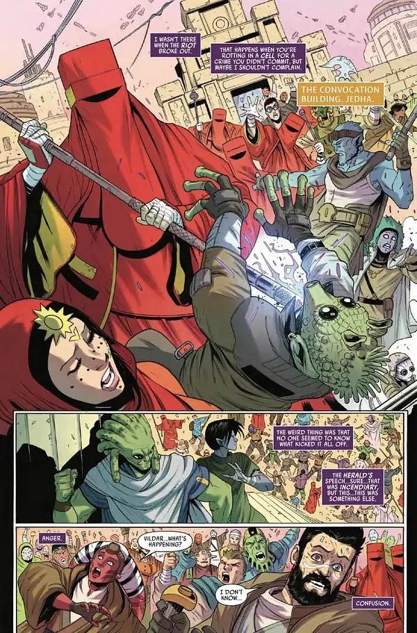 Issue #5 of The High Republic (Phase II) picks up where last month’s installment left off, with a riot having broken out on the steps of the building housing the advisory body of Force religions known as the Convocation of the Force.