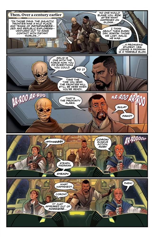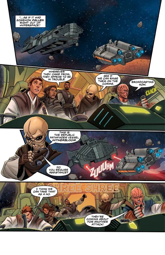 Interestingly, The Nameless Terror #1 actually begins in the era of The High Republic’s first phase (set a couple hundred years before the events of the Skywalker Saga) and catches us up with monster hunter– and former Jedi– Ty Yorrick from 2021’s The Monster of Temple Peak, along with her persnickety protocol droid KL-03. We then flash back to even further in the timeline, during the period of Phase II, as Yorrick recounts a story she heard from her old master about the above-mentioned Pathfinders. Traveling through uncharted territory, the team discovers a ship in distress and attempts to help, but that ship then immediately attacks them without call. The confrontation results in both vessels crashing onto the surface of a nearby planet, where the Pathfinders must care for the injured among them while investigating what exactly caused the scuffle in the first place. Little do they know that outside of the enemy’s derelict ship, a brightly colored egg has hatched and… well you can probably guess where this is going from here. The book quickly evolves into a Star Wars take on Ridley Scott’s now-classic 1979 sci-fi horror film Alien, with the Pathfinders scrambling to make sense of what’s happening while being attacked from two fronts– and those who are caught up with recent The High Republic output like the novel Path of Deceit and the audio drama The Battle of Jedha can likely guess which faction was occupying the ship containing the eggs.