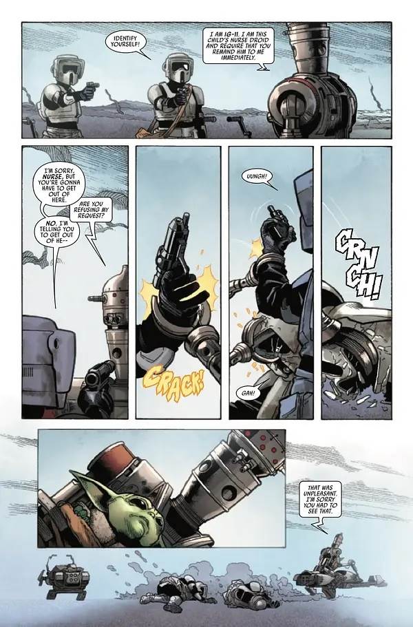 This was the Taika Waititi-directed episode that began with two wise-cracking Imperial scout troopers beating up poor Baby Yoda (still a number of months before we knew him as Grogu), and then that no-nonsense former assassin droid IG-11 swooping in to the rescue. Meanwhile, our heroes Din Djarin, Cara Dune, and Greef Karga are trapped in Nevarro City’s cantina as Moff Gideon and his battalion of troopers wait patiently outside for them to surrender. In the comic version, writer Rodney Barnes does a good job of compressing things slightly without sacrificing too many of my favorite moments from the episode, such as Grogu pushing back against a flametrooper’s barrage and IG-11 convincing Djarin it’s okay for him to remove his helmet in front of him without breaking the Mandalorian code, as he’s not technically a living thing. The pacing is pretty consistent throughout, though there are a couple of transitions between action scenes and smaller, quieter character moments that felt a little forced in this format.