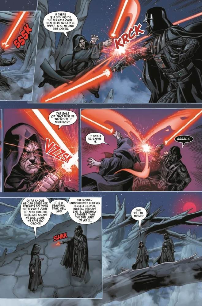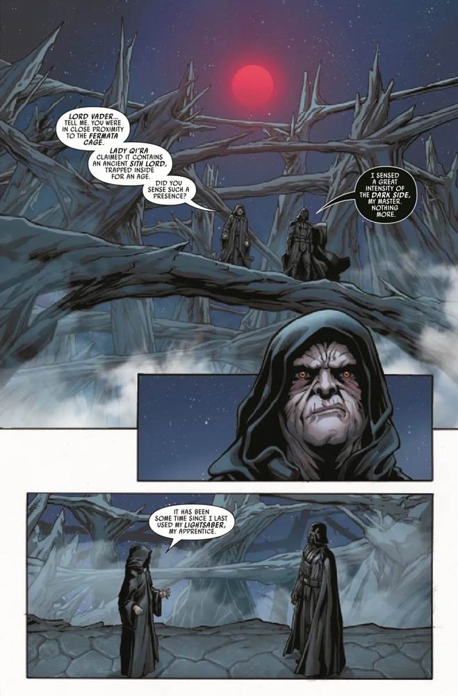 Does the Fermata Cage contain a Sith Lord from ages past, frozen in time? Or will it be a trap for Lady Qi’ra’s sworn enemies, the Sith Lords Darth Vader and Darth Sidious (AKA Emperor Palpatine)? Sadly we don’t quite find out in this issue, but there is at least the possibility that we’ll know by the end of next month.