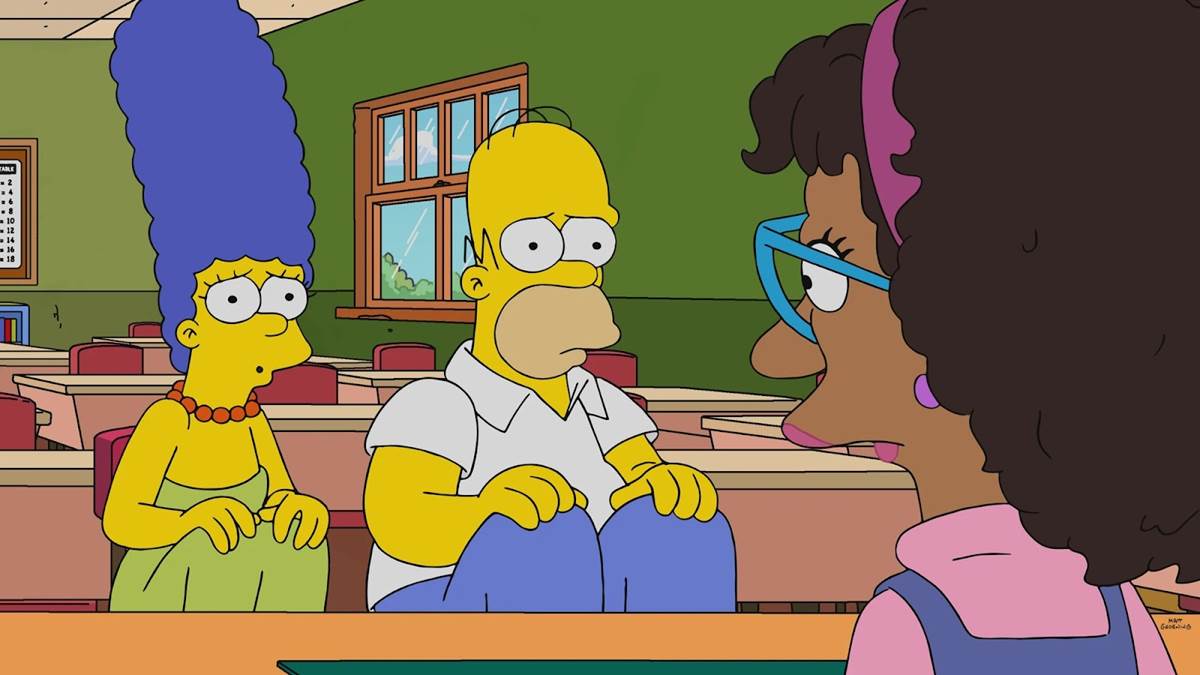 Anyway, some three-plus decades later, and Bart Simpson (voiced, as always, by Nancy Cartwright) is still a prankster and a bad influence, so much so that his parents Homer (Dan Castellaneta) and Marge (Julie Kavner) freak out when he helps a group of kindergarteners deface some children’s books, writing themselves into the stories. But when the teachers reveal they’re actually supportive of this creative idea during a parent-teacher conference, Marge and Homer realize that while they do love their son Bart, they don’t actually like him. That night in bed, Homer and Marge imagine a world where Bart had never been born and instead of living on Evergreen Terrace, they’re up in the posh Springfield Hills living an idyllic life in the house from Parasite, for some reason. In Bart’s absence, Homer has landed himself a cushy dream job as the guy who runs the sound effects and scoreboard for the Springfield Isotopes baseball team, while Marge works at a veterinarian hospital inspired by soapy Shonda Rimes dramas like Grey’s Anatomy. The latter is a running gag that never quite lands, mostly because it doesn’t go along with the game of the dream-world’s conceit, but that’s emblematic of this episode as a whole– it’s got a clever premise but doesn’t ever quite figure out what to do with it.