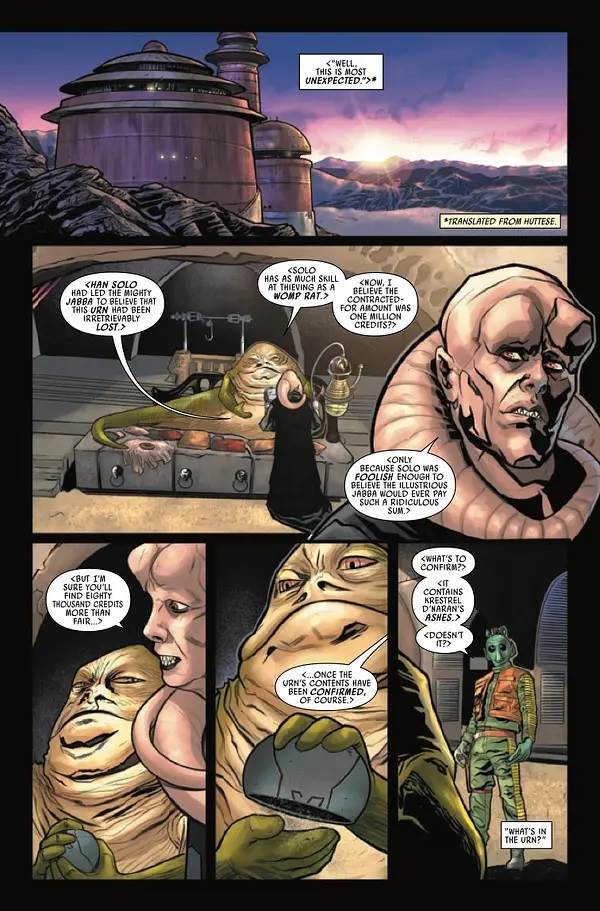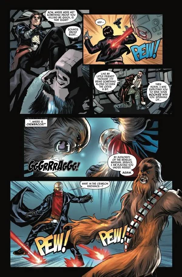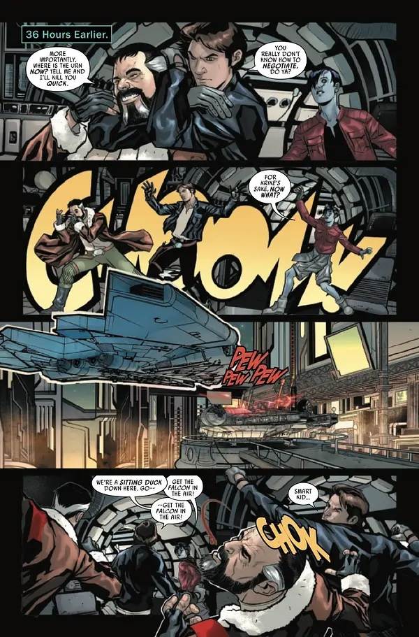 Han Solo & Chewbacca #10 begins with a flash-forward to the Rodian bounty hunter Greedo delivering the long-sought-after urn to Jabba the Hutt on Tatooine. We– and many of the characters in this story– were initially told the urn was supposed to contain the ashes of one of Jabba’s main rivals, but as we found out in the previous issue, it actually held the memory core for a deadly freedom-fighting droid named Ajax Sigma (who first appeared in an ominous Force vision to Darth Vader in the Star Wars: Revelations one-shot). Back in the “present" of this comic (36 hours earlier), Han tussles with the con-artist called Corbus Tyra– the man who pretended to be Solo’s father Ovan in earlier issues. This also sees the introduction of the training remote used by Obi-Wan Kenobi and Luke Skywalker in A New Hope to the Millennium Falcon’s hold, but that’s just a fun Easter Egg. We then cut to Chewbacca on the Smugglers’ Moon of Nar Shaddaa, where the Wookiee is busy dealing with Marshal Buck Vancto and a rival gang of smugglers. Back on the Falcon, Han tells his new ally Phaedra to launch the ship, but their egress is impeded by the other smugglers’ similar Corellian vessel.