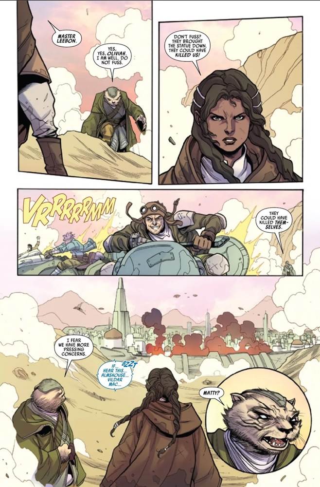 At that point it just becomes a matter of finding a place where bystanders can hole up until the battle is over, and Vildar Mac decides that place is the local bar known as Enlightenment, which is run by the Villarandi Kradon Minst. Enlightenment was heavily featured as a location in the audio drama Star Wars: The High Republic - The Battle of Jedha, so it makes sense that it would reemerge here as a potential safehouse for those attempting to evade the turmoil in the Jedha streets. Vildar throws Kradon’s previous insistence that Enlightenment is a “sanctuary" back in his face, and the gathered masses take up residence in the bar as they wait for the conflict outside to blow over. It’s a fun, intriguing ending for this issue, and the cover of next month’s installment promises that we’ll be spending more time in Enlightenment, a prospect that I find especially appealing. In the meantime, I thought writer Cavan Scott and artist Ario Anindito once again did an excellent job putting this issue together, and I loved seeing how all the various participants in these rather dire circumstances on Jedha were dealing with the confusion and discord. Plus, now we have the backstory for how that collapsed Jedi statue from Rogue One fell in the Jedha desert. I really enjoy when Star Wars gives us connective tissue like that, and this sort of history is a big part of the appeal of The High Republic in general.