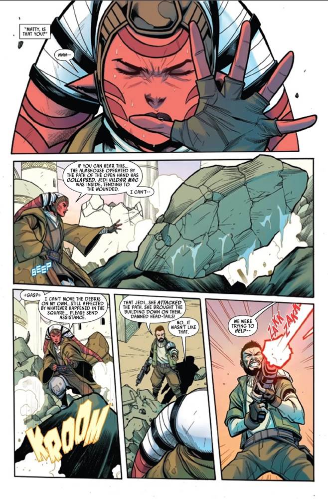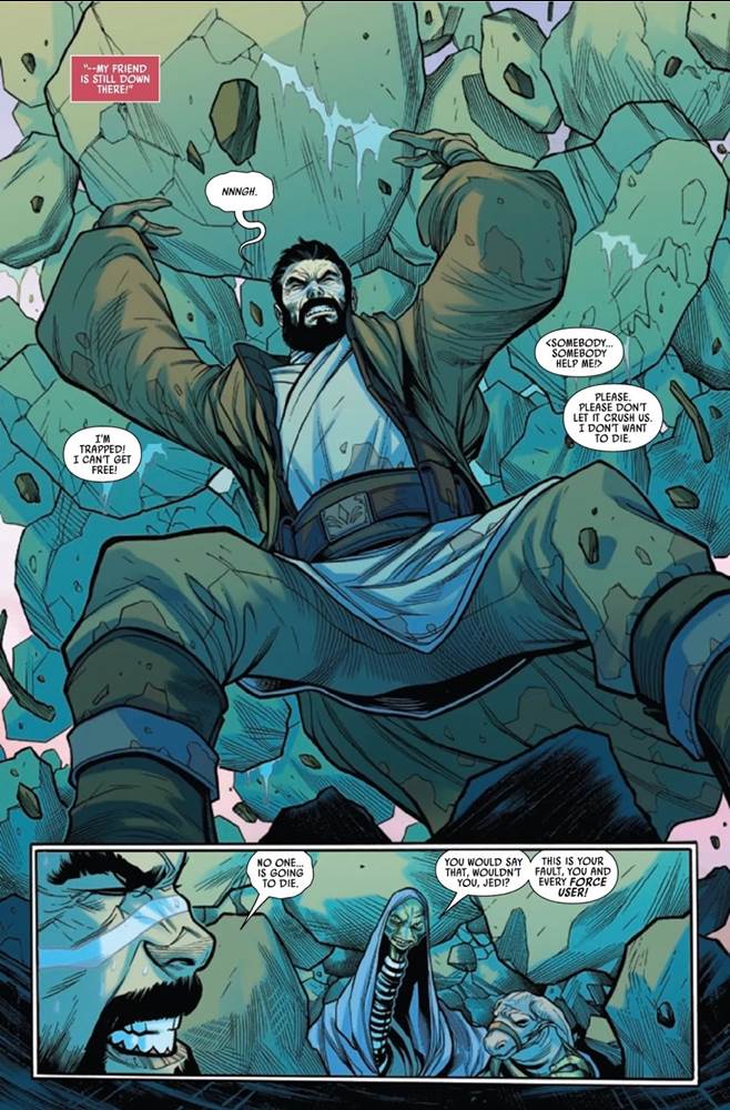 In the cliffhanger ending of last month’s issue of Star Wars: The High Republic from Marvel Comics, Jedi Knight Vildar Mac found himself buried alive beneath the collapsing almshouse occupied by the Force cult known as the Path of the Open Hand.