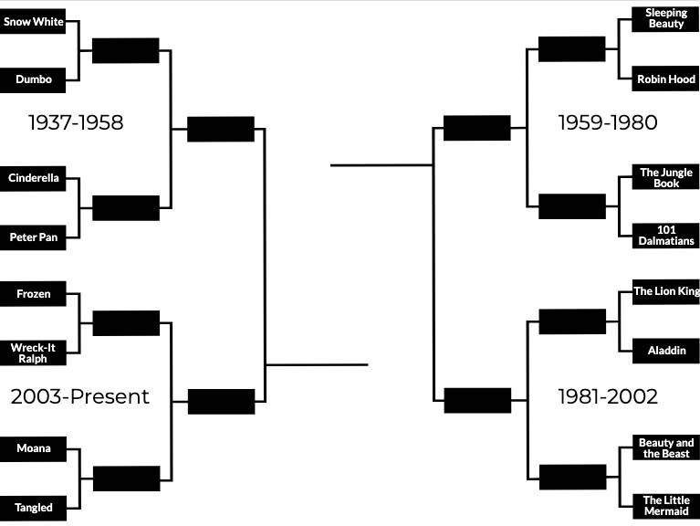 The first step was breaking the bracket into four regions. After trying several different categories (Princesses, Cult Classics, Modern Hits, etc.) we decided the easiest way to break it all down would be simply to go by date of release. That left us with the four regions of 1937-1958, 1959-1980, 1981-2002 and 2003- present.