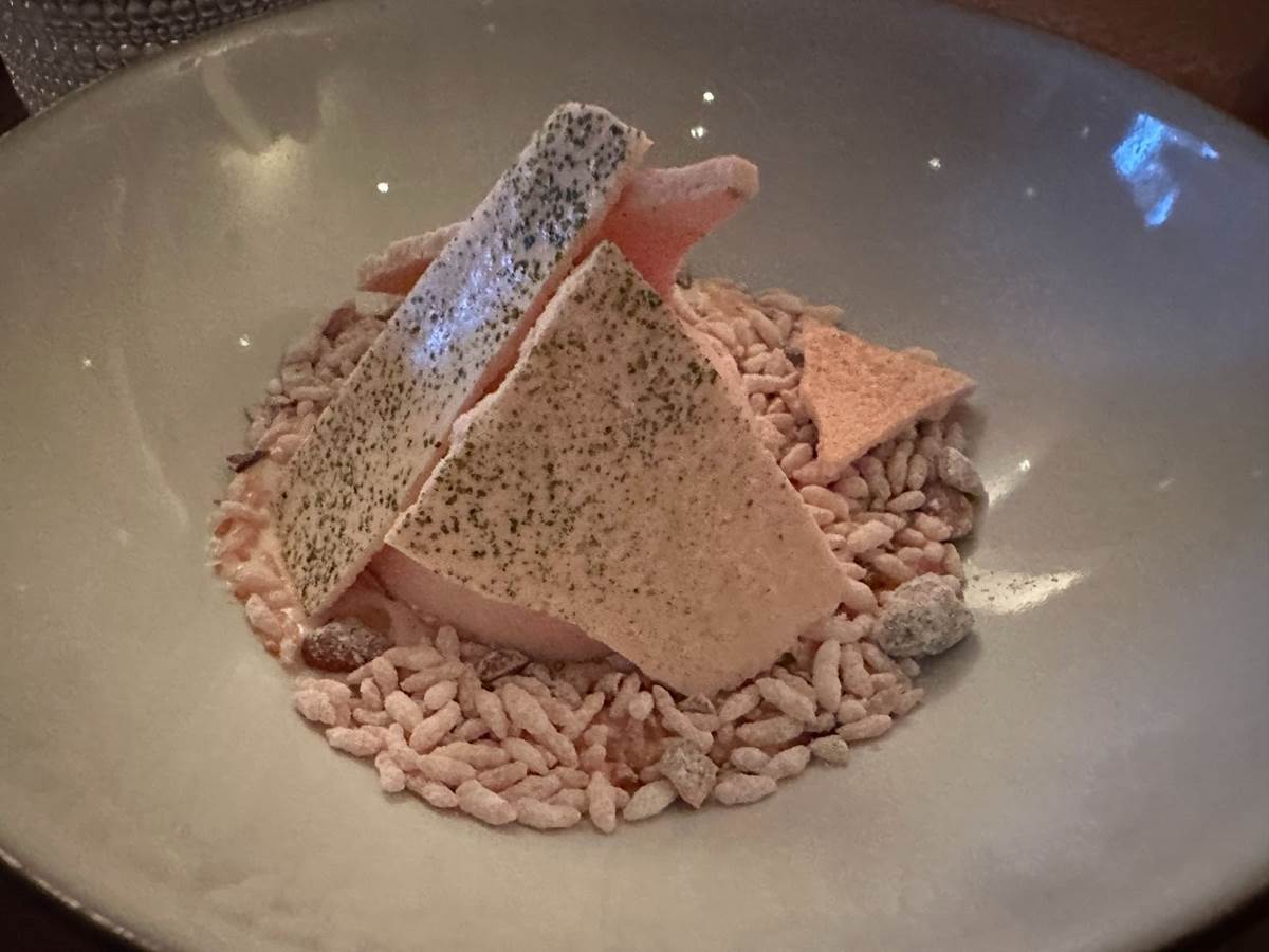 The dessert was inspired by two destinations. In Brazil, Kristin remembers seeing strawberries everywhere, taking pictures of herself with cartoon strawberry characters, which she said didn’t make the final episode cut. This Strawberry Semifreddo was served atop puffed rice, which was an ingredient she worked with in Maine.