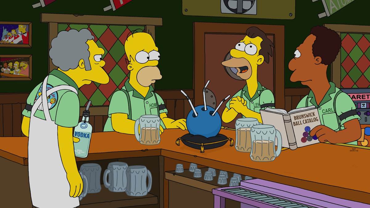 This new episode, entitled “Pin Gal" (itself a play on the name of Homer’s bowling team the Pin Pals, established back in the beloved seventh-season episode “Team Homer") opens with Homer discovering via the local Springfieldian news broadcast that Barney’s Bowlarama has been sold to the hipster character named Terrence (Portlandia’s Fred Armisen, also returning to a preexisting Simpsons character, though this one has only been around for a decade), who plans to turn it into a coffee shop without bowling. Naturally the Pin Pals– currently made up of Homer (Dan Castellaneta), Moe Szyslak (Hank Azaria), Lenny (Harry Shearer) and Carl (Alex Désert)-- are upset about their favorite pastime and hangout (outside of Moe’s Tavern, that is) going away, (I love Homer’s line here, “Why do all the places that nobody goes to anymore keep shutting down?") so they beg Terrence to give them a week to turn the business around. After Homer’s various efforts to do so fail, including locking customers into the Bowlarama– which he says the fire department frowns upon– he convinces a reluctant Marge to join him for an all-night bowling marathon. And Homer is shocked and delighted to find that Marge is actually extremely good at the indoor sport, though she is scared he might find out the real reason why. But when Terrence presents them with a challenge: if Marge can beat a professional bowler, the alley will stay open– Homer surprises his wife by bringing in a coach (the aforementioned Jacques) to help solidify her game before the match.
