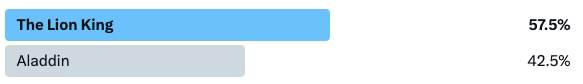 Before we move on to our next matchup, let’s take a look at our last result. It was much closer than the previous results but The Lion King did manage to get the win over Aladdin. The beloved film may not have to wait too much longer to be king as it moves on to the second round.