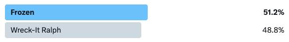 Before we move on to our next matchup, let’s take a look at our last result. We knew it was going to be a close one and it certainly was. In the end though, Frozen just managed to sneak out a win and get past Wreck-It Ralph to move on to the second round. The first round was a good time to stay in and cuddle but put Olaf in the second round and he’ll be a… happy snowman.