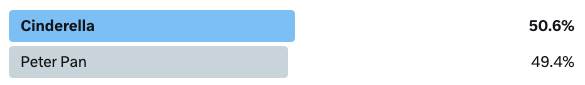 Before we move on to our next matchup, let’s take a look at our last result. It was a very exciting meeting of two classics that came right down to the wire. In fact, this was the closest matchup in Mouse Madness history with Cinderella winning by just 1.2% of the vote. The clock has not yet struck midnight on this literal Cinderella story, even after a great showing from Peter Pan. This sets up a very interesting second round matchup between Cindy and Snow.