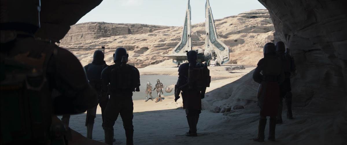 In the flashback, we see an even baby-er Grogu cowering behind some Jedi protectors as clone troopers blast their way through hallway doors. Then he’s whisked away into an elevator and up toward the biggest and most welcome surprise of the episode: the Jedi Master Kelleran Beq (played by none other than Jar Jar Binks himself, Ahmed Best) who was introduced for Lucasfilm’s Star Wars: Jedi Temple Challenge kid-focused game show. Beq fights his way out of the temple and through the crowded Coruscant cityscape on a speeder, then into a Naboo ship that’s waiting on a platform, which they use to blast off into space and away from the deadly Jedi Purge. This is a thrilling sequence, both on its own and for those who have wished any kind of redemption on Ahmed Best as a Star Wars actor, which he has certainly achieved in this episode. I also wonder if this might actually be a set up to a spin-off of some sort, either in live-action or animated formats, detailing the adventures of Kelleran Beq and Grogu between the events of the prequels and The Mandalorian.