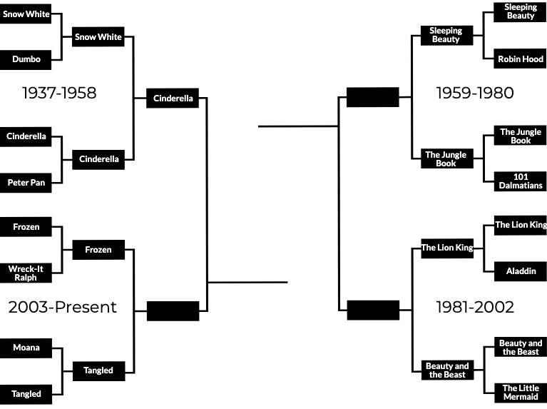 Now, let’s find out who will be joining Cinderella in the Final 4. The final two in the ‘59-’80 region will duke it out. The top-seeded Sleeping Beauty will look to keep the dream going while The Jungle Book will try to swing right into the next round. Will the Disneyland castle and iconic villain win out? Or will the more memorable music take it home?