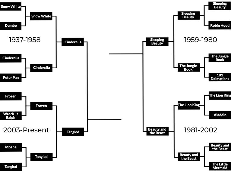 Before we move on to our next matchup, let’s take a look at our last result. It was another shocker as, for the first time in forever, Frozen came out on the losing end. Tangled grabbed the last spot in the Final 4 and it wasn’t even close. Now, we’ll see if Tangled will see the light of the championship as it meets up with Cinderella in the next round.