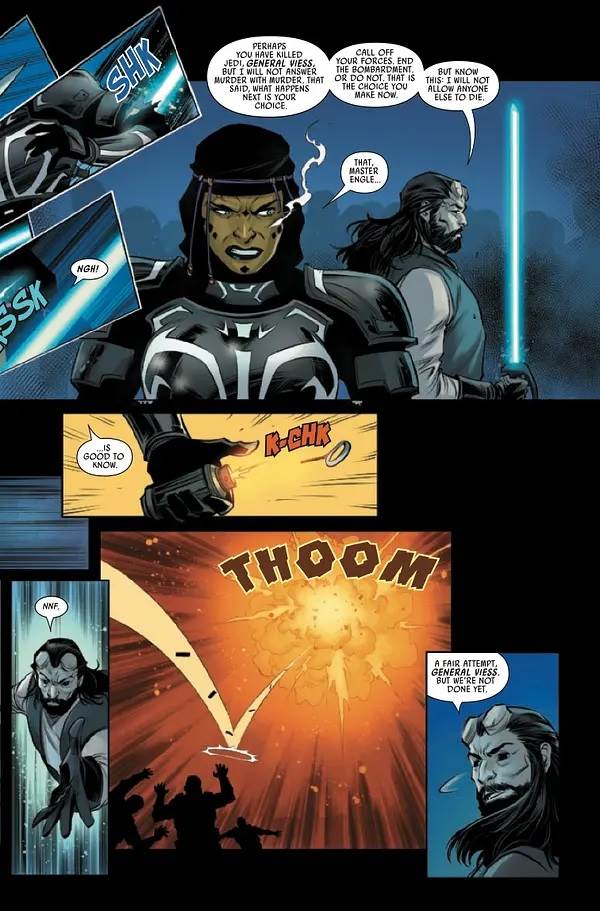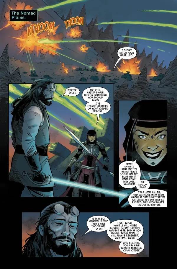 Porter Engle finds himself on the battlefield out in front of the walled city of Firevale, face-to-face with the “Jedi Killer" mercenary General Viess, though of course Engle (known as the “Blade of Bardotta" later on in the Star Wars timeline) is able to defeat her in hand-to-hand combat without difficulty. Despite repeated offers to end the conflict peacefully, Viess reacts to her dueling embarrassment by ramping up hostilities on Firevale, and even massacring the forces of its opposing city who hired her in the first place. Meanwhile back in Firevale itself, Porter’s adopted sister Barash Silvain discovers a dark truth about this savage dispute– it was spurred on by the star-crossed prince and princess of their respective cities, who had planned to depose the queen and take control themselves, lying to the Jedi about their personal involvement in the process. After the truth comes to light, the princess takes to the city’s parapets to stop her people from attacking Firevale and instead turn on the ruthless mercenaries who betrayed them.