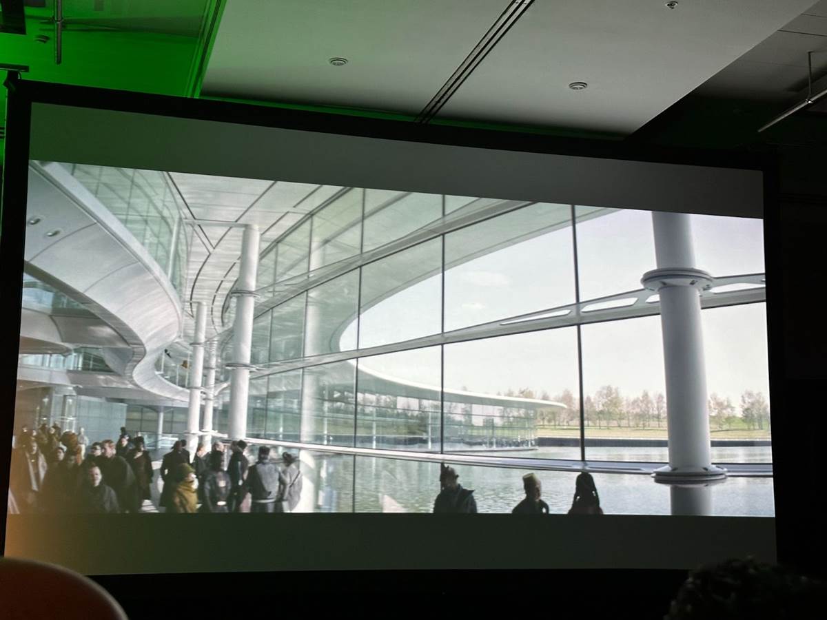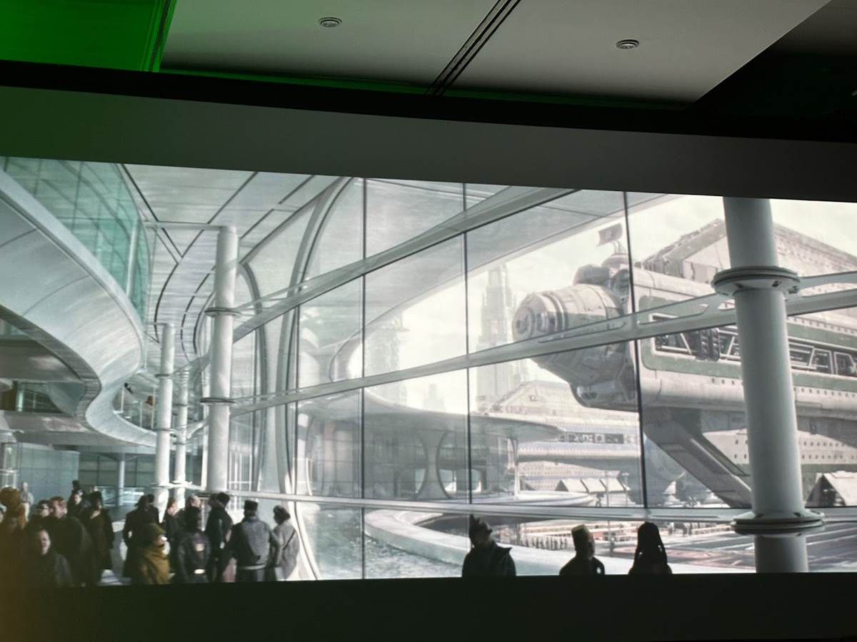 Lucasfilm Visual Effects Producer TJ Falls oversaw logistics for each shot, heavily involved in the pre-visualization phase and carrying all the way through post-production. He and Mohen Leo worked together on Rogue One and were well-versed in the style that would carry through to Andor. To help ground the series in reality, physical sets and locations were used as much as possible. TJ was part of the locations scouting team, matching up concept art with real locations that could be married together. The McLaren Technology Centre in Surrey, for example, was the location of a shipping port. The concept art didn’t have a water feature, but a lake outside of the curved windows cast water reflections onto the ceiling. Rather than remove them, the art was modified to give the terminal a water feature.
