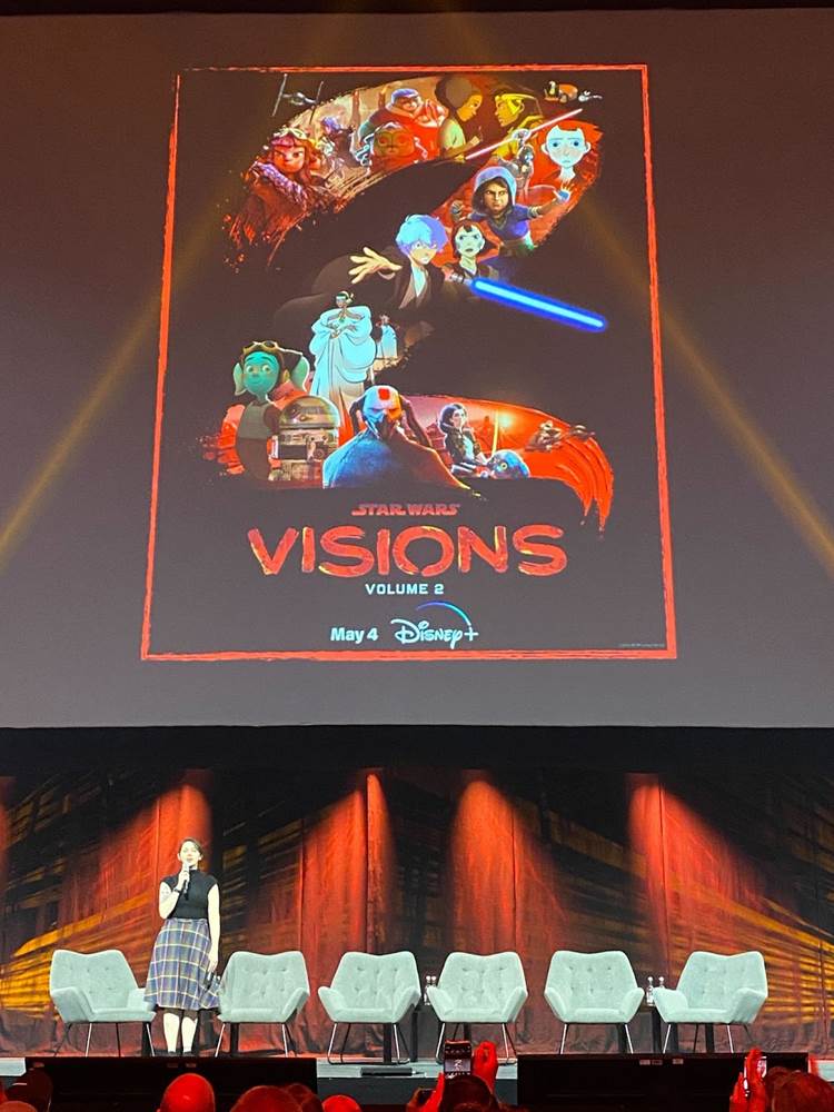 Next came time for the Star Wars: Visions panel, with Vol. 2 of the series of animated shorts headed to Disney+ next month. Unlike the first volume which was limited to anime studios from Japan, this batch of episodes has been made by animation companies from around the world. We saw the trailer for the full season, then we heard from each individual filmmaker, who talked about their story and characters, and how much they were influenced by Star Wars as creatives. Then at the end of the presentation, after Ratcliffe had signaled for the livestream to end, the audience in the room were treated to a screening of Aardman’s short for the project, which I can say was a tremendous amount of fun. The poster for Star Wars: Visions Vol. 2 was also revealed during the presentation, and then everyone in the audience was given the opportunity to take one home with them.