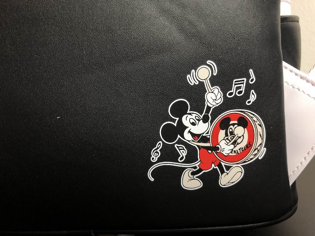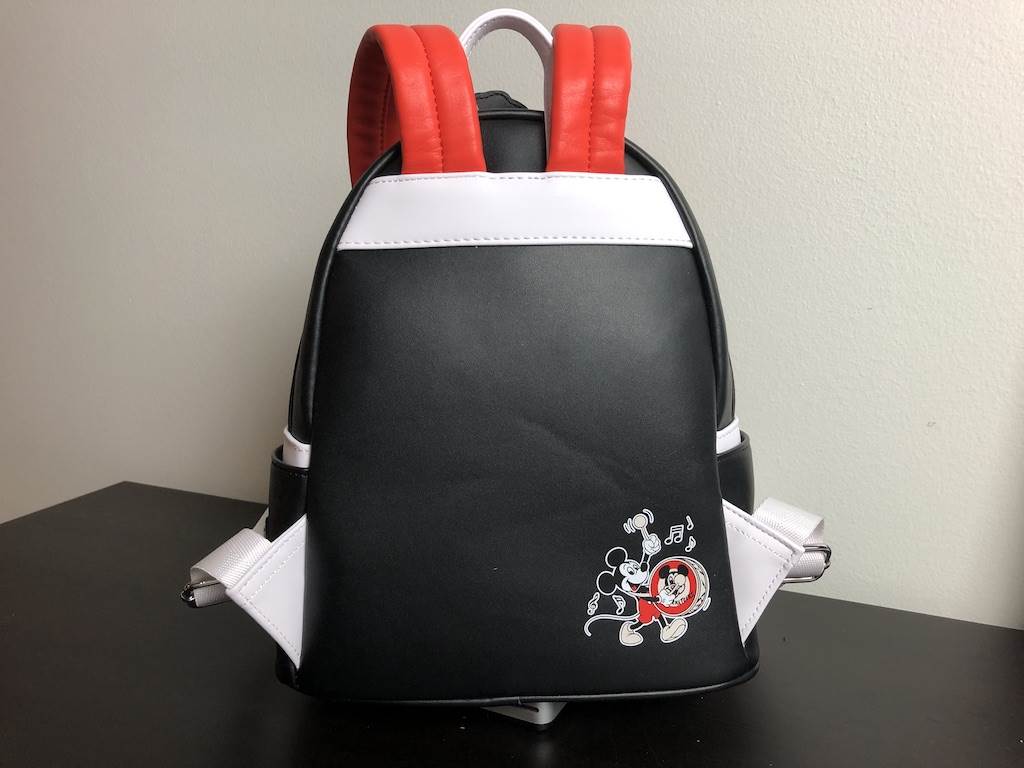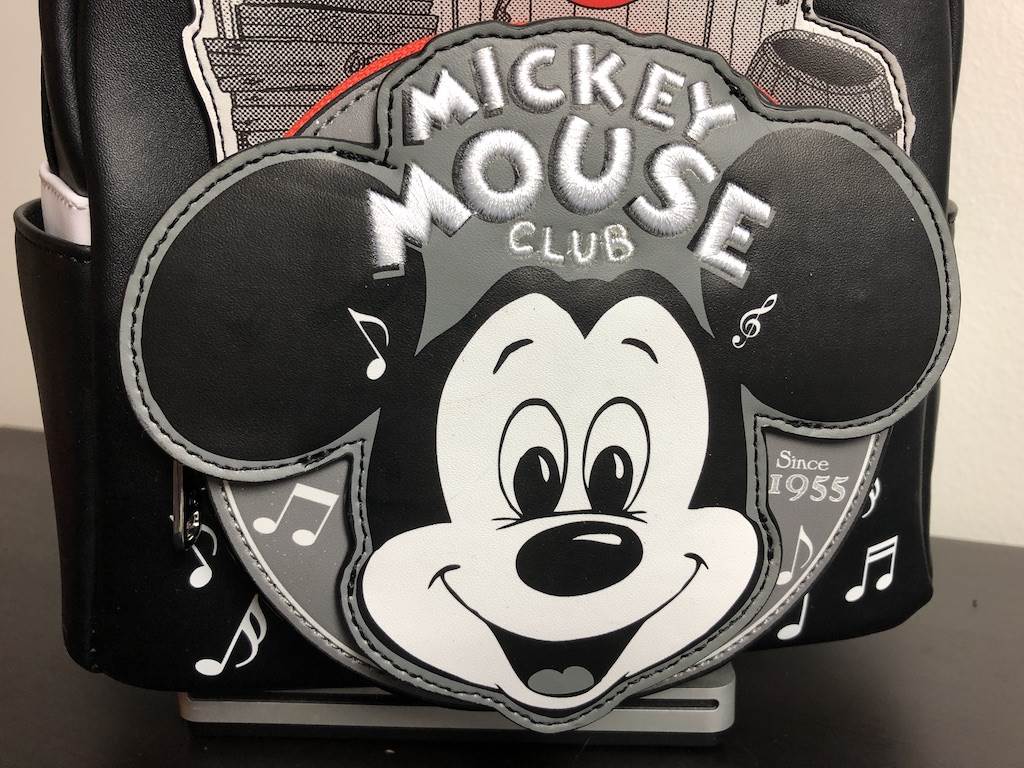 Loungefly will often add dimensional elements to their bags and for this particular style, it’s the Clubhouse on the front and the Mickey Mouse face on the front pouch that truly pop. The Clubhouse features the original Mickey Mouse Club logo on the door though it is part of full image and not raised in any way. The Mickey portion on the other hand, includes embroidered “Mickey Mouse Club" lettering with full and complete stitching. As for the back, the bottom right hand corner is decorated with a small icon of the “leader of the band" marching and playing a large bass drum.