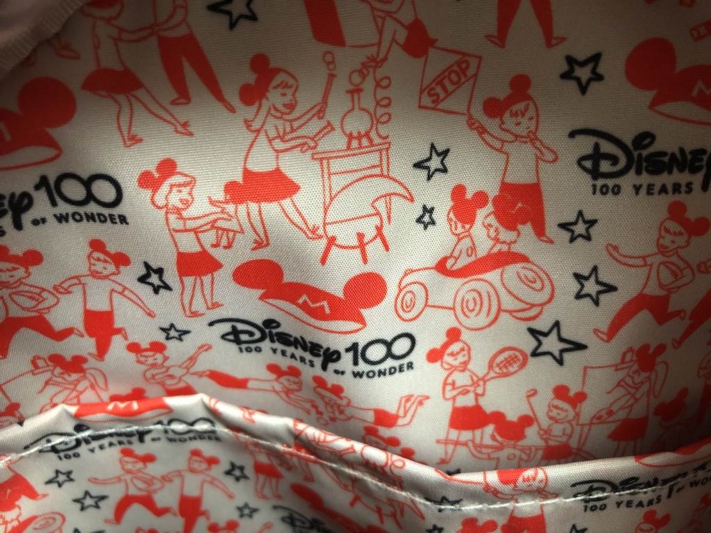With this bag designed to commemorate Disney100, it includes a D100 product tag (intended to be removed) and “Disney100; 100 Years of Wonder" wording on the interior lining. Speaking of the lining, this pattern is adorable and very retro, something longtime fans will appreciate. The background is off white or ivory and is decorated with black and orange (or maybe red?) images of MMC members wearing their Mickey Mouse ears and playing sports, driving, attending school and enjoying each other’s company.
