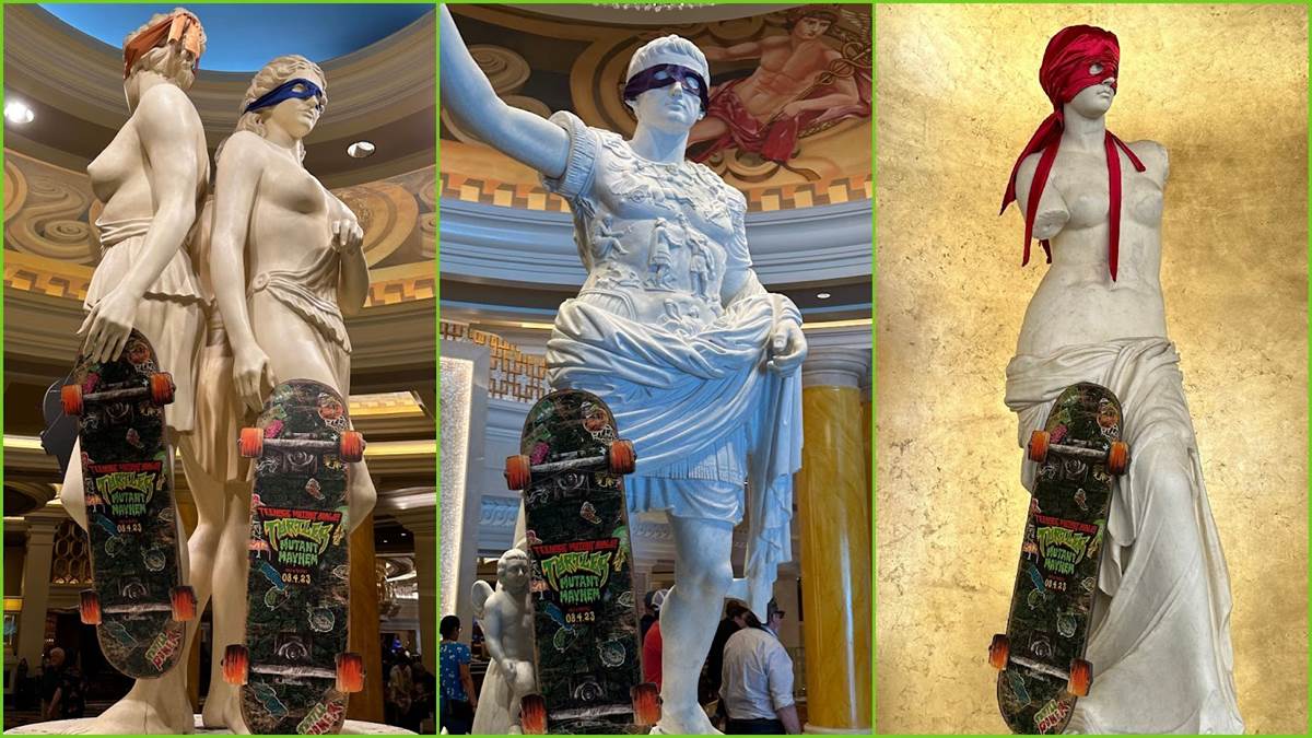 Caesar’s Palace was overtaken by the Teenage Mutant Ninja Turtles, with eye masks affixed to the resort’s statues and graffitied skateboards in their hands to promote the new animated film.