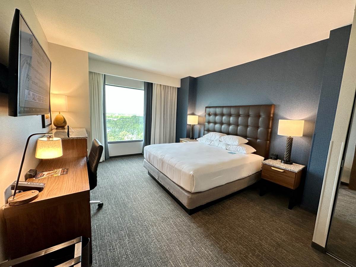 The Drury Plaza Hotel continues the Drury Hotels concept of starting with an iconic and historic building. In this case, they took a hotel that opened in 1971 with the opening of Walt Disney World and renovated it while also adding to it. Now consisting of two towers, the Palm (formerly the Best Western Lake Buena Vista) and the Cypress Tower, each room feels classic but offers the most contemporary in-room amenities including include a 55″ smart flat screen television, mini refrigerator, microwave, alarm clock with Bluetooth and charging station, executive work spaces, and in-room safe.