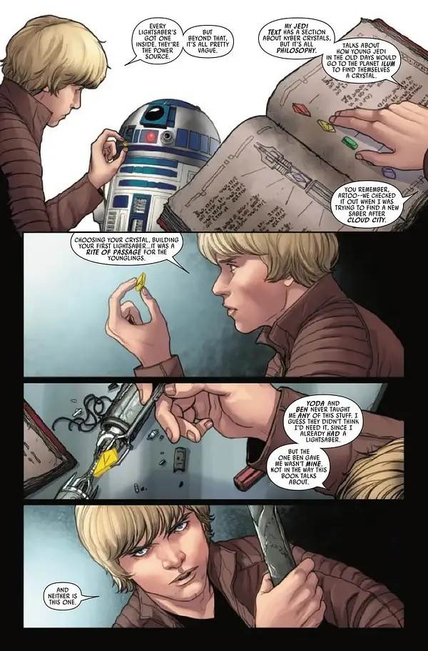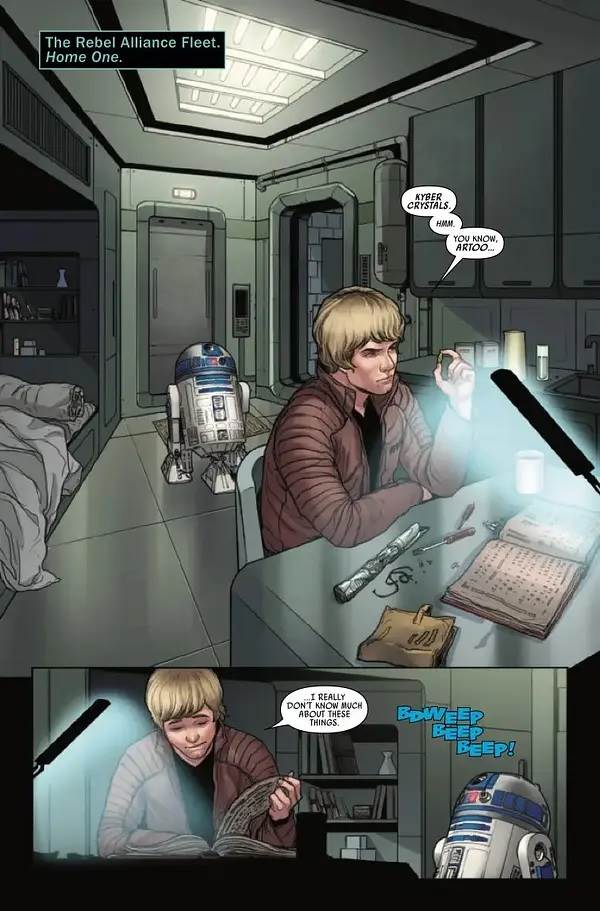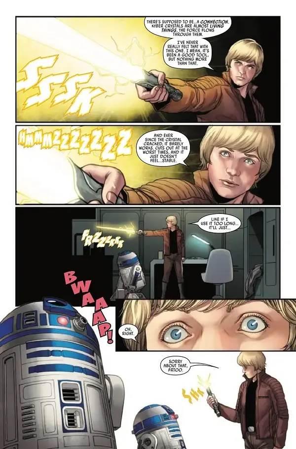 Gretta says the denizens of the bar would have captured Luke and sold him to the Empire, but he’s upset that she wiped them all out. She offers to bring him to find some actual Kyber nearby on the planet, and Luke is hesitant to accompany the killer but eventually relents. Along their journey on Gretta’s speeder, they’re attacked by a giant lizard-like creature, and Luke’s yellow lightsaber is on the fritz again. He attempts to use the Force to calm the beast, but is interrupted by an explosion. Out of the dust steps the doctor known only as Cuata, who was introduced in Star Wars: Catalyst - A Rogue One novel back in 2016. Cuata once worked alongside Galen Erso as an expert on Kyber crystals, and evidently in the wake of the Death Star’s creation he has settled on Christophsis to continue his research. That gives us this month’s cliffhanger ending, with Cuata requesting that Luke hand over his current lightsaber, and next month’s cover promising that Skywalker may wield both red and green-bladed laser swords. That should be taken with a grain of salt, however, as this issue’s cover showed Luke grasping what I assumed to be a green Kyber crystal in his closed fist, energy spilling out. That misdirect aside, this is another terrific issue by Soule and new artist Madibek Musabekov (Star Wars: Obi-Wan), and I’m very glad to see forward momentum happening in Luke’s story. Plus, as someone who read and enjoyed Catalyst seven years ago, I was excited to get that connection to the James Luceno novel as well. The only thing I didn’t understand was why Luke apologized to Artoo in the bottom panel of the following page. Can someone please explain that to me? I’m very confused.