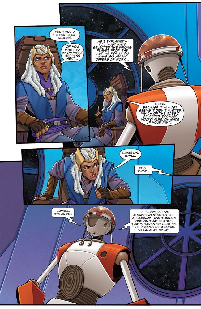 KLO, as he’s called for short, has directed Yorrick’s unnamed YT-750 freighter toward a planet evidently occupied by a rogue Acklay (see the Geonosian arena sequence in Star Wars: Episode II - Attack of the Clones for the first depiction of that fearsome creature), though Ty suspects there’s another clandestine reason why they’re heading there. Regardless, KLO convinces Yorrick to continue with the story, and we flash back to the Jedi who have entered the hull of the ship, with the Leveler pursuing them nearby. They block off the hole and soon find themselves confronted by members of the Path. The Force-worshiping cultists famously dislike Jedi, but are forced to form an uneasy alliance with them in order to get help for their injured companion named Geth. Meanwhile, in another part of the ship, the Bith Jedi Master Tarl slowly recovers from his injuries while Sula and Ambar look after him, waiting for the others to return to the cargo bay. Soon the Republic Pathfinder called Pako makes his way back, having briefly scared off the Leveler by using the ship’s power to electrocute the monster. But the creature isn’t warded off for long– it begins thudding around the top of the ship again, frightening just about everyone inside as The Nameless Terror continues to borrow horror-movie tropes.
