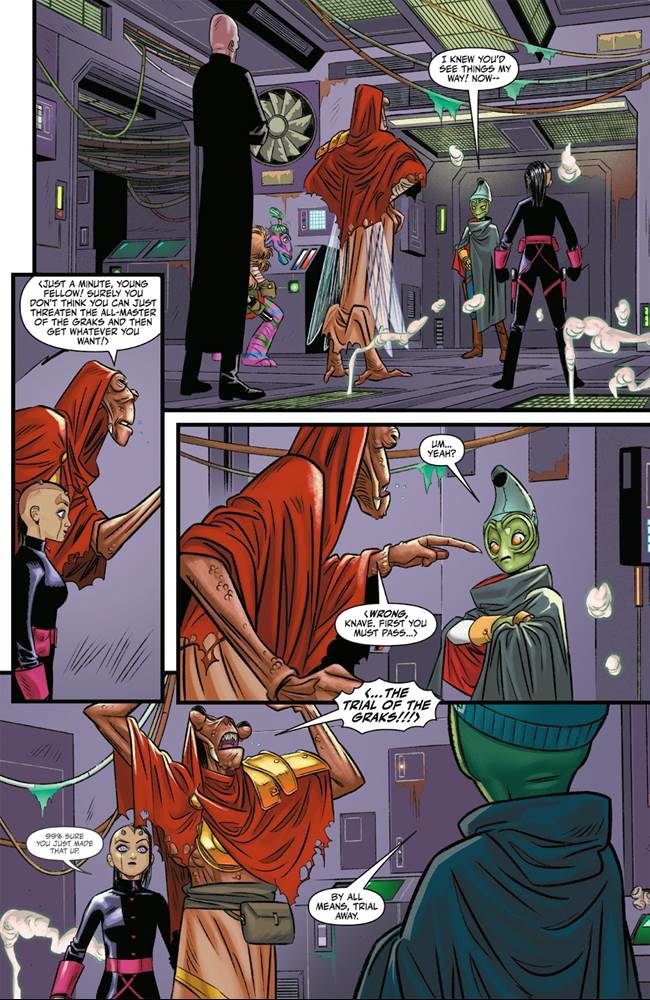 The High Republic Adventures (2022) #4 is another very fun issue following the Jedi Padawan Sav Malagán on her adventures with two warring groups of space pirates. This installment begins with pirate queen Maz Kanata having been captured by her rivals the Dank Graks, and Sav attempting to go undercover with that group to save her new mentor. The Graks and their leader Arkik Von are naturally distrusting of Sav, who is going by the name of Bazrip Ratht, so they put her (posing as a him) through a series of tests– including Bazrip’s background with a Force cult call the Central Isopter, his/her ability to use the Force, and Baz’s skill at combat against a group of deadly droids. Sav/Baz handily passes the tests and is granted a provisional membership in the Dank Graks, though not everyone on the team is happy about it. One member who is happy, however, is the Zabrak Saya Keem, who immediately takes Sav under her wing, giving her a tour of the Graks’ ship the Grim Devourer and revealing that she knows Sav is only pretending to be a boy. Sav and Saya bond quickly over their mutual status as outsiders among their own groups, while on another ship the Venomed Scabbard Maz’s crew travel to Jedha based on a tip Sav transmitted.
