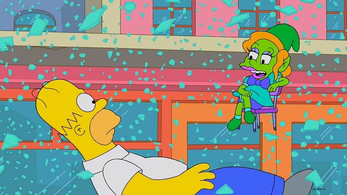 But this installment, titled “Homer’s Adventures Through the Windshield Glass" (a reference not only to Lewis Carroll’s beloved Alice in Wonderland stories, but also to a Troy McClure car-safety film from way back in season 4) begins with a terrific, pause-worthy couch gag that crams in 750 characters from throughout The Simpsons’ history– a welcome nod to the fact that this is indeed the series’ 750th episode. After that, we see Homer (voiced, as always, by Dan Castellaneta) angrily storm out of a local bank and into his car, which he drives recklessly through the streets of Springfield until he loses control while sending a furious text to Marge and crashes into a fire hydrant. Then time immediately slows down for Homer, and over the next 20 minutes or so we see him experiencing the crash in super-slow motion, as his head approaches the supposedly shatterproof windshield glass and then breaks through, sending him flying toward a tree.