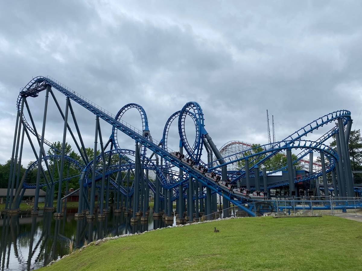 I recently rode Goudurix at Parc Asterix in France, which I called one of the worst coasters I’ve ever had the misfortune to ride. Blue Hawk could have had the same distinction, being a very similar coaster from the same manufacturer, Vekoma. Heck, they both have beautiful lakeside settings. What gives Blue Hawk a supreme edge is the new trains it received in 2017, that feature vest restraints instead of the old, bulky over-the-shoulder restraints. Along with a slightly improved track, this makes Blue Hawk a fun, forceful, and pretty coaster experience.