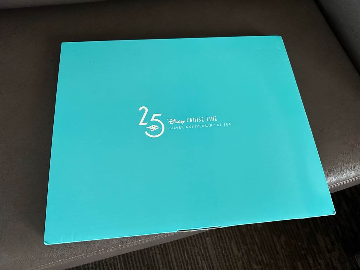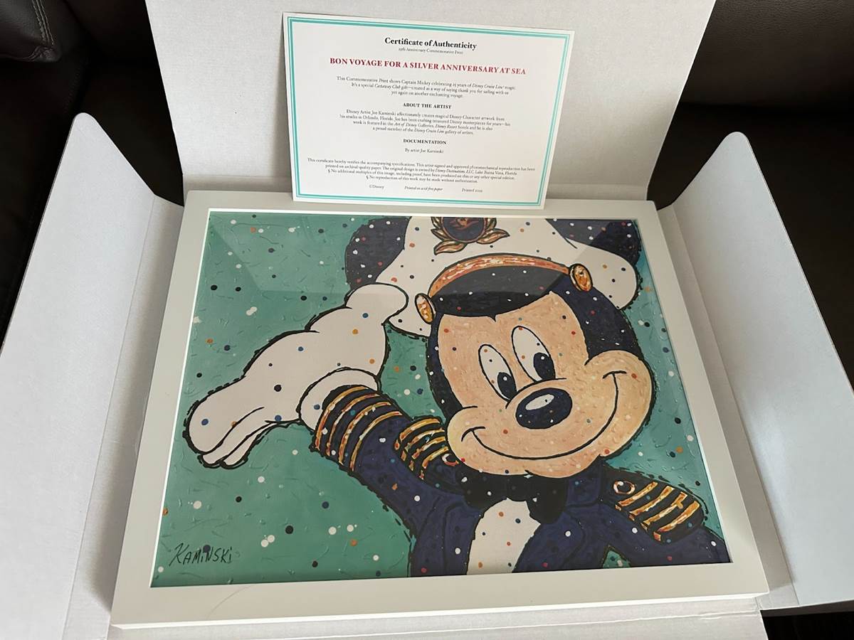 Delivered to your stateroom on the final night of your sailing is this framed art print by Joe Kaminski, who has several other Disney Cruise Line art prints available for sale on every ship in Disney’s fleet. The painting depicts Captain Mickey in his classic outfit, with a background that matches the Silver Anniversary’s sea foam blue.