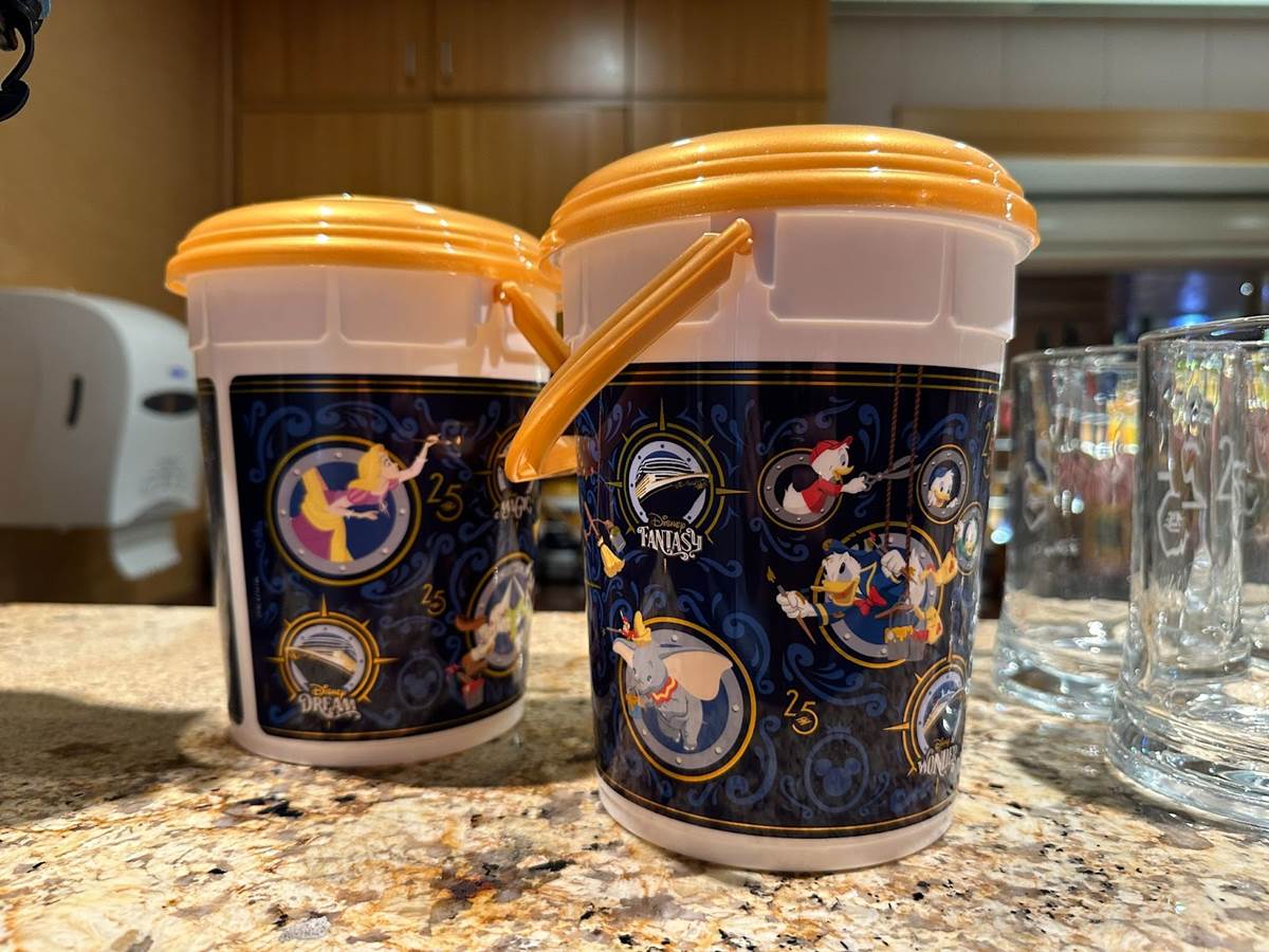 A new 25th Anniversary popcorn bucket is available at Preludes, featuring iconography from all 5 ships - the Magic, Wonder, Dream, Fantasy, and Wish.
