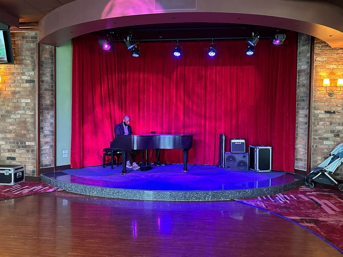 No detail is too small, with custom carpet featuring floating piano keys and silhouettes of jazz instruments.