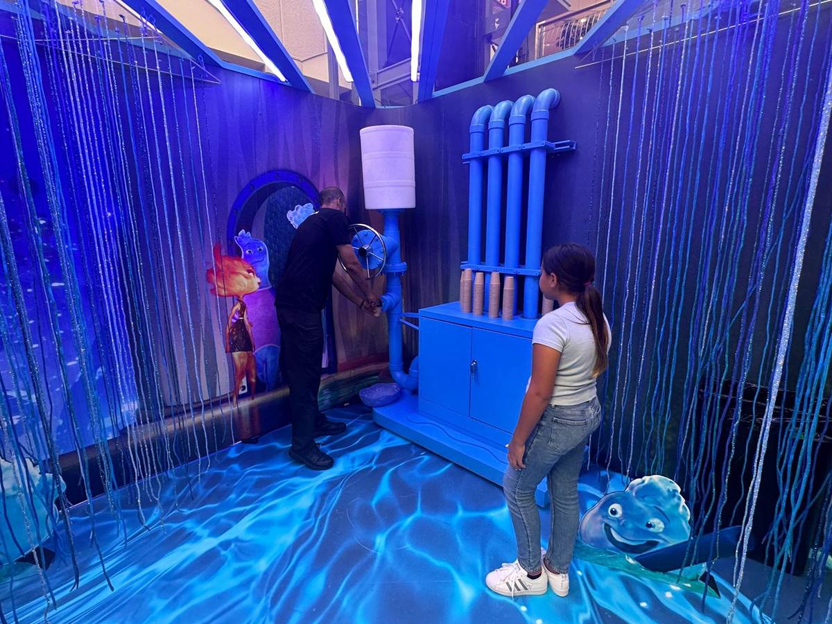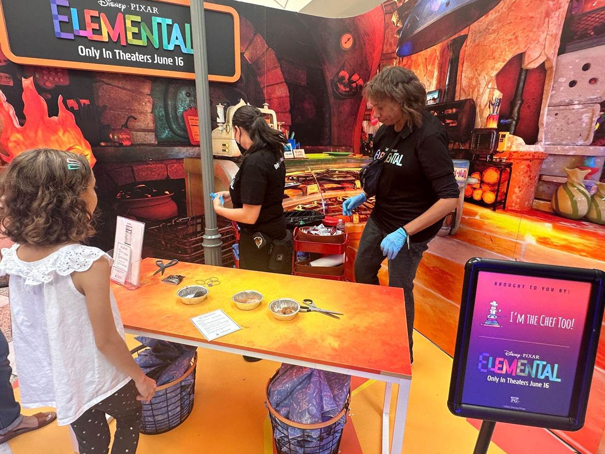 The experience includes different stations inspired by each element featured in the film. Earth is represented by a photo op with Clod and some apple seeds that you get to take home with you. The air section is a wind tunnel where guests have the opportunity to grab Fandango movie tickets. Wade’s water element is a hydration station while Ember’s fire is a cooking activity presented by “I’m a Chef Too." There is also an area recreating Pixar Animation Studios where kids of all ages can draw characters while getting video instructions from Pixar artists.