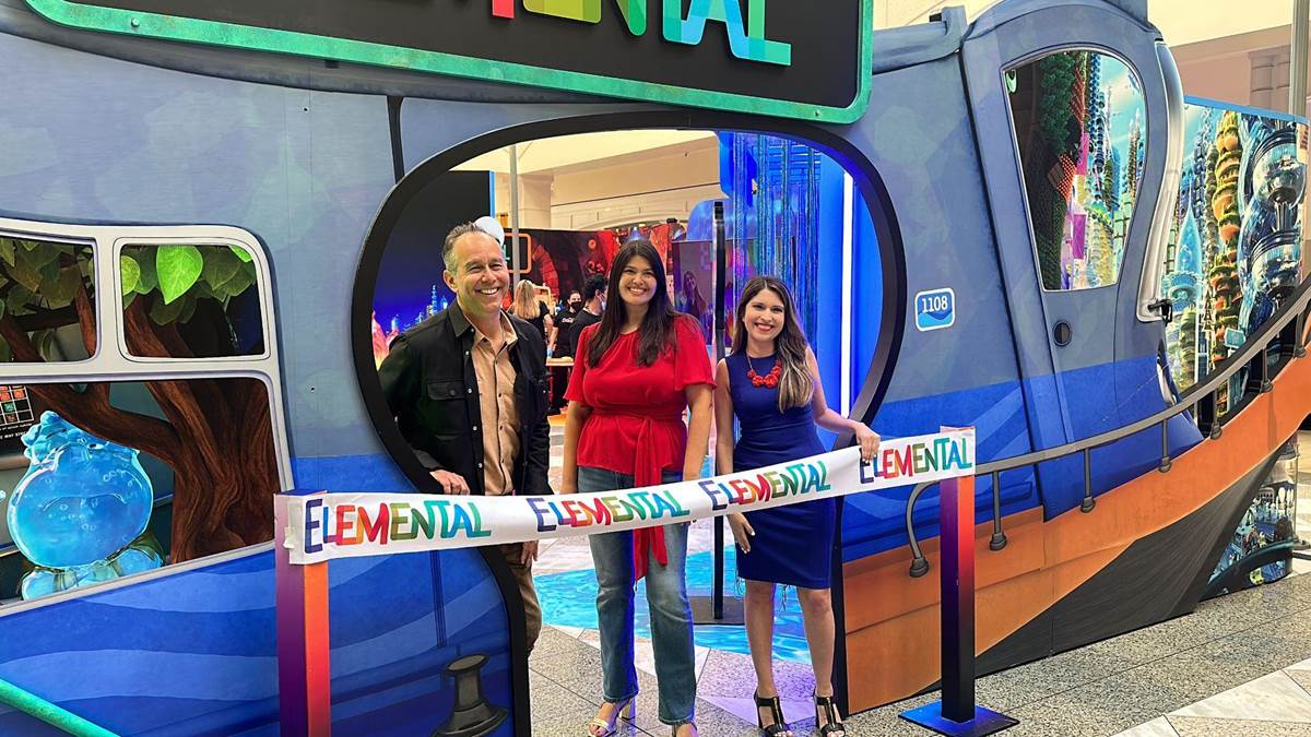 The Elemental Experience Mall Tour comes to a close this weekend with a stop at the Hillsdale Shopping Center in San Mateo, California. To kick off the (last) opening, Directing Animator, Gwen Enderoglu and Pixar’s EVP of Production Jonas Rivera participated in a ribbon cutting in the mall’s Center Court.