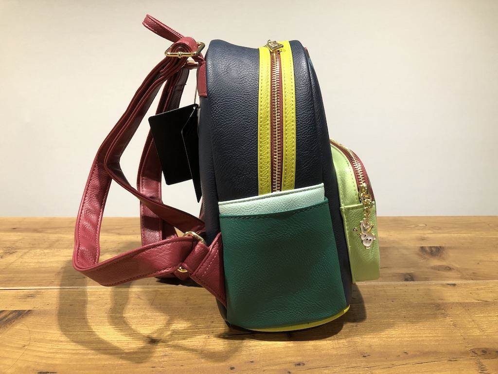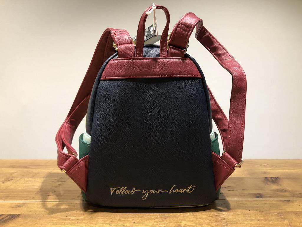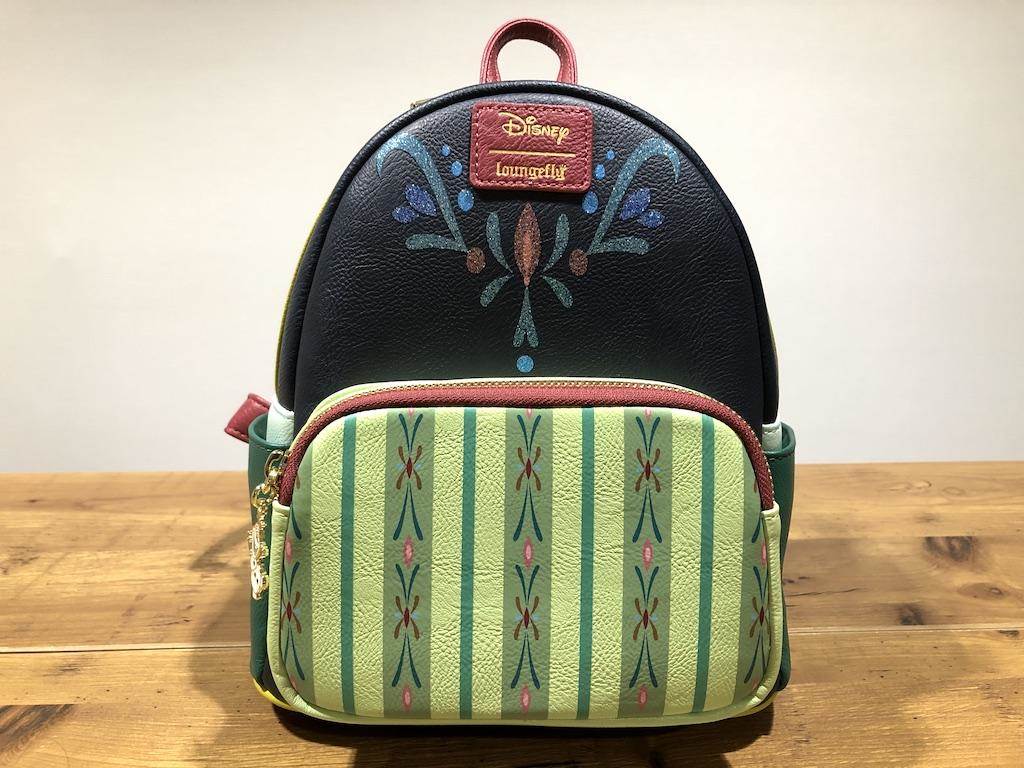 Like a majority of Loungefly’s mini backpacks, this adorable bag features a front zippered pouch, two side pockets, a main zipper compartment and small interior pocket. It measures 10 1/2-inches tall, 9-inches wide, and 4 1/2-inches long. Since Anna’s green dress is the theme, they’ve captured all of the elements and displayed them on various parts of the bag.