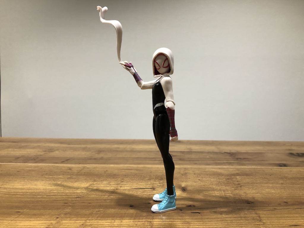 Unlike many of the action figures we talk about at Laughing Place, Spider-Gwen is not part of the popular Marvel Legends series of collectibles. This particular toy is definitely meant more for play and less for display as she features only six points of articulation. She has no extra heads or hands but does come with one web shooting accessory that attaches to her wrist. As with most Hasbro action figures, Spider-Gwen measures 6-inches tall.