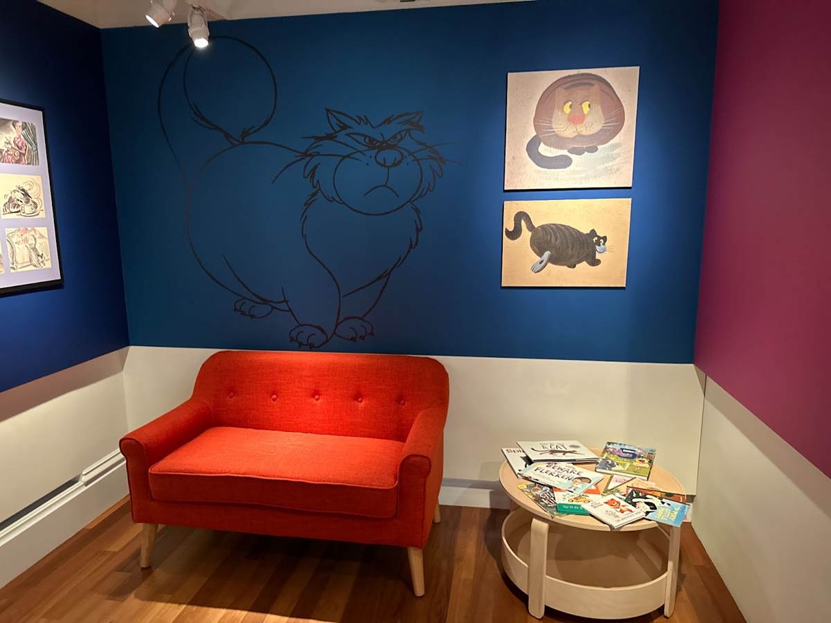 Lucier’s corner features a break space for little ones in the form of a comfy couch and a table full of children’s books, which stay on the theme of dogs and cats. Several of them are Disney-related and available for purchase in the museum gift shop.