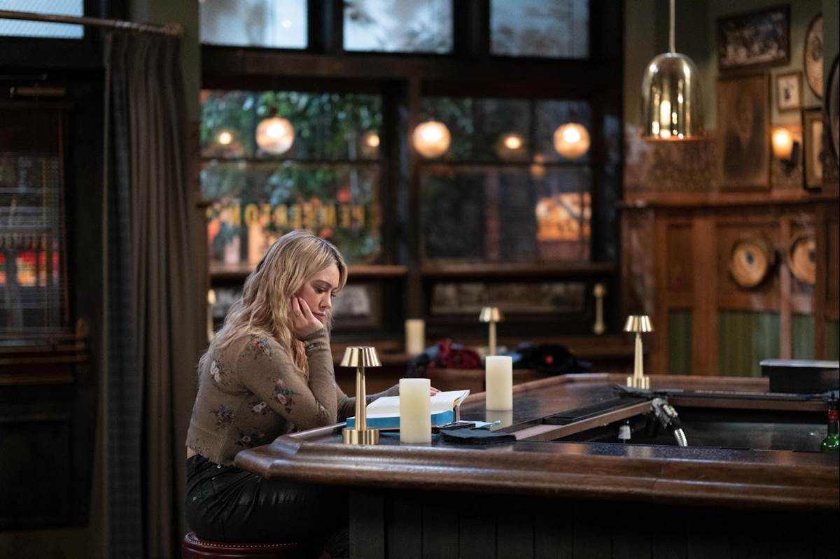 At Pemberton’s Bar, Val, Ellen, Sophie, Sid, and Charlie, (Francia Raisa, Tien Tran, Hilary Duff, Suraj Sharma, and Tom Ainsley) watch as weatherman Sandy Rivers (Alexis Denisof) describes the destruction of the upcoming storm. Sid is worried about how long the storm will last because Hannah (Ashley Reyes) could potentially be flying through the storm.
