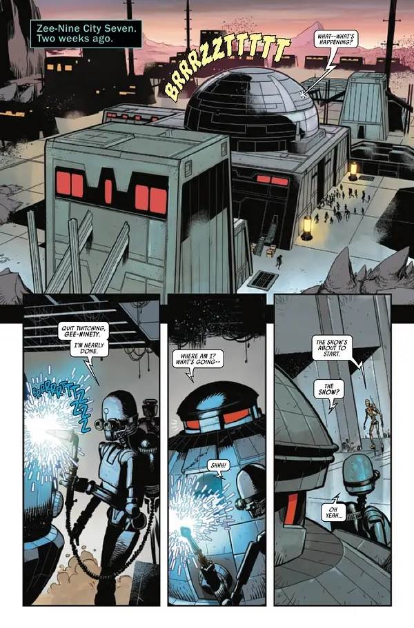 Darth Vader Vol. 3 #36, released today, begins at the droid-run settlement in Hutt Space known only as Zee-Nine City Seven, which was first seen in issue #13 of this same comic. But now a group of droids, all of whom have been wronged (or even killed, on multiple occasions) by the Dark Lord of the Sith, have gathered to enact a revenge plan against the villain. The only thing is, all these droids happen to currently be allied with the Galactic Empire, and as the point out, Vader is the outcast in this particular situation, having recently run afoul of Emperor Palpatine. The leader of this uprising is named Ought-Six, the former captain of the Droid Crush Pirates of Bestoon, and he’s joined by Gee-Ninety from the Assassin’s Guild, the devious torture droids Triple-Zero and BT-1, Imperial forensics droid Zed-6-7, and even Arex, a droid destroyed by Vader just after the rise of the Empire (in writer Charles Soule’s Star Wars: Darth Vader Vol. 2). Anyway, all of these forsaken droids gather together with a bunch of others and attack Darth Vader, who has been accompanied by rogue archaeologist Dr. Chelli Lona Aphra and Sith assassin Ochi of Bestoon to the planet Ringo Vinda, where they have acquired the Zaly Shield– an artifact capable of focusing Vader’s Force powers in the wake of the Fermata Cage having been opened and making the life-fueled energy field go haywire galaxy-wide.