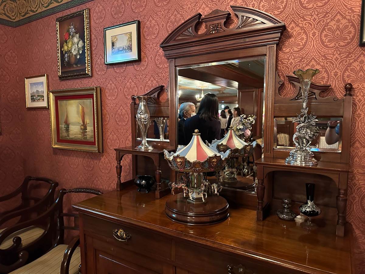 Tokyo Disneyland’s Club 33 is accessed via a secret door in World Bazaar (the park’s version of Main Street U.S.A.). Inspired by the VIP club of the same name at Disneyland, the decor transports Guests back to the opulence of the Victorian era, with artwork that connects to Disney history, like a tapestry of Neuschwanstein Castle and models of a train, a steam ship, and a carousel.