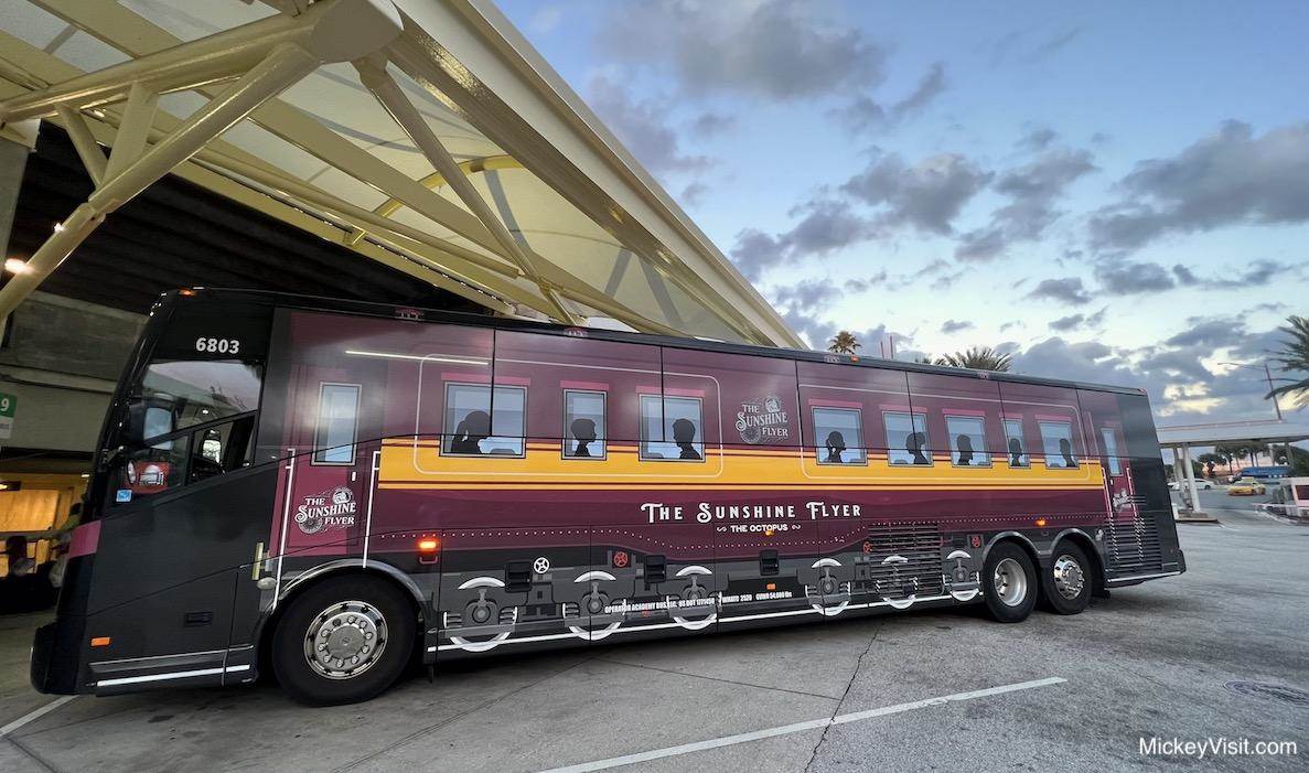 The Sunshine Flyer, a bus service that transports guests from Orlando International Airport (MCO) to Disney World Resorts. The experience is themed around old-fashioned passenger cars and train locomotives, with the buses designed to reflect this and the staff dressed as 1920s rail conductors and engineers. The Sunshine Flyer services start at 4am and it services flights starting at 7:30AM, and the last bus departs the airport at 11pm. There is also a Sunshine Flyer Direct private service that takes guests directly from the airport to most Walt Disney Resort Hotels. We compare Mears Connect vs Sunshine Flyer here.
