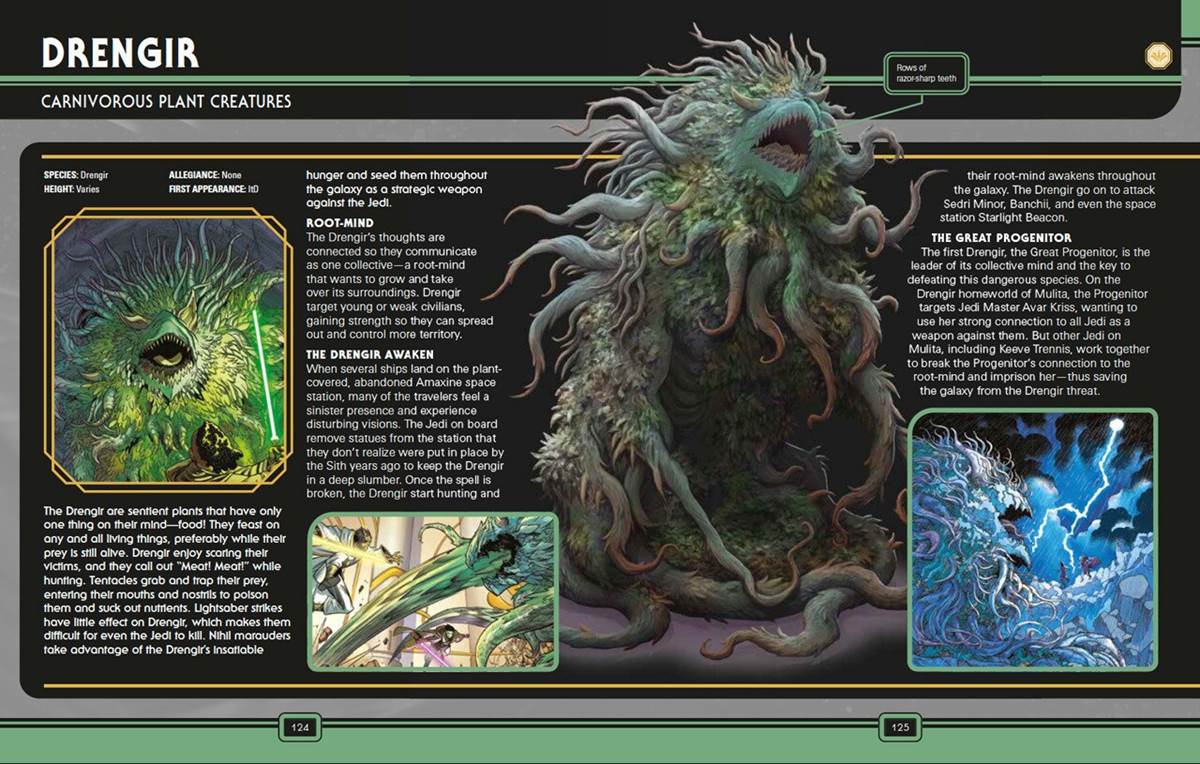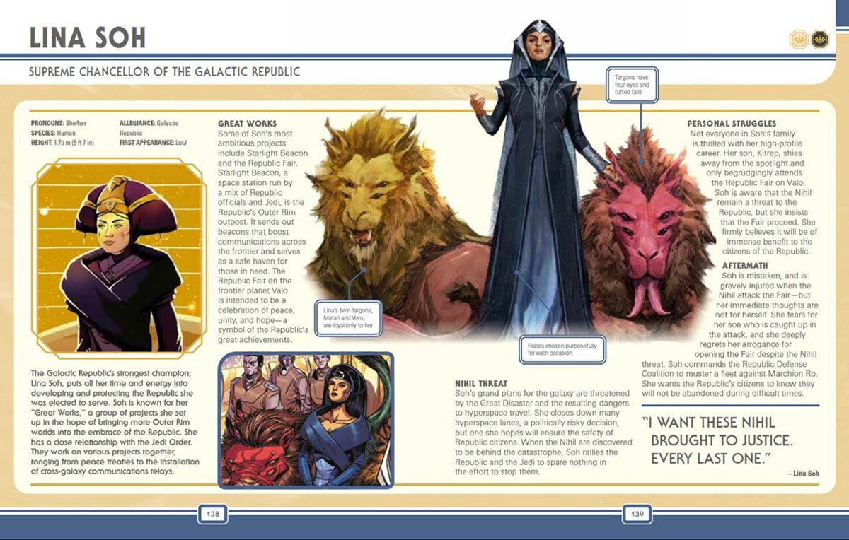 - Interior spreads from The High Republic Character Encyclopedia (Jedi Master Stellan Gios, Chancellor Lina Soh and the dreaded Drengir)