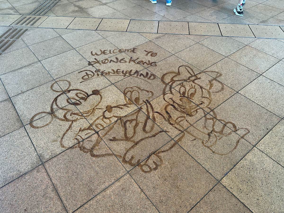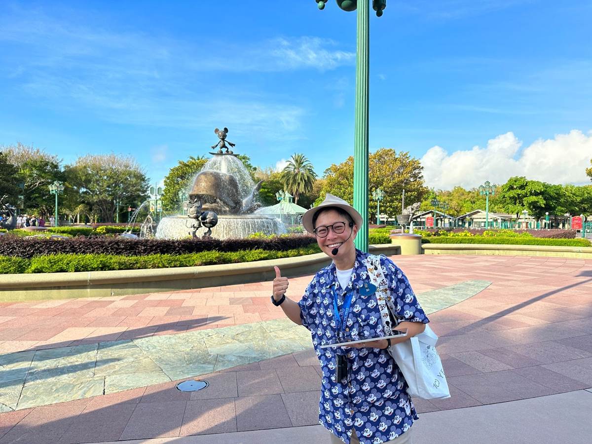 An area of the Hong Kong Disneyland lobby was set up with coffee and pastries at 6:40 am, including iced coffee since the temperature was already hot and humid. At 7:00 am, we walked as a group to the esplanade of Hong Kong Disneyland, where we were split into two groups and assigned an Imagineer. We got Jo, a creative director at the park, who started by talking about the fountain in front of the park, which features Mickey and his pals enjoying water activities, symbolizing their journey from Anaheim to Hong Kong.