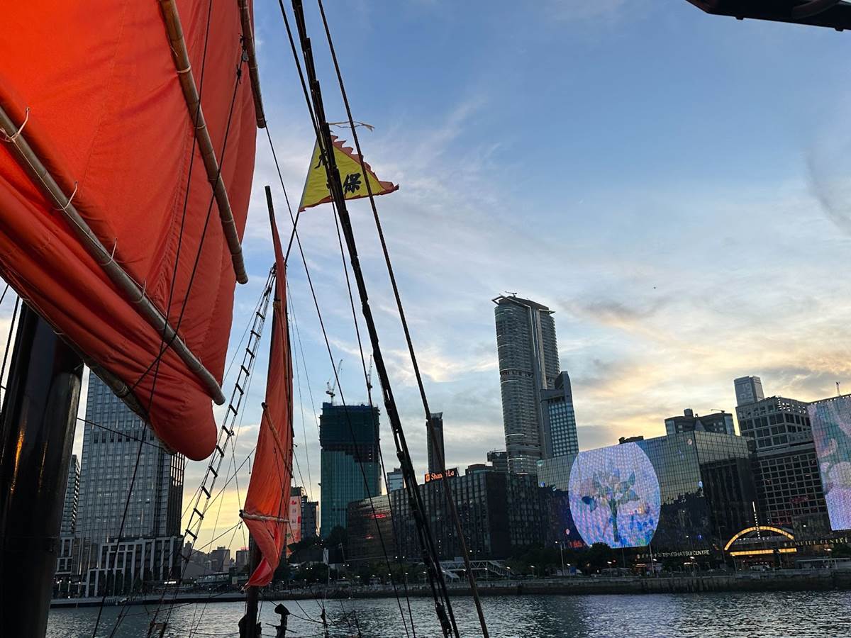 Our bus to Kowloon Public Pier departed at 5:15, just outside of the park’s main entrance (Guests who relaxed at the hotel could take a different shuttle from the hotel). Once there, our local guide gave us a short tour of the pier, from which we could see the precursor to dinner, a Junk Boat Cruise.